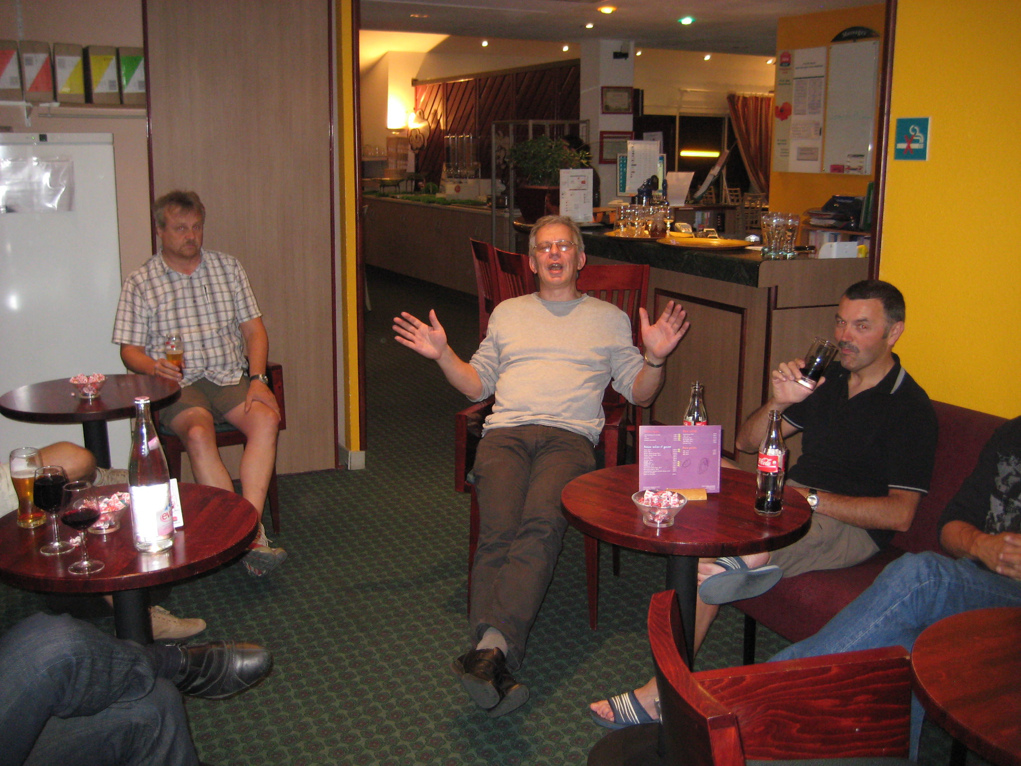 De gezelligheid zit er al goed in. We bouwen een klein feestje in de bar van het IBIS voor de verjaardag van de Charel. Proficiat!