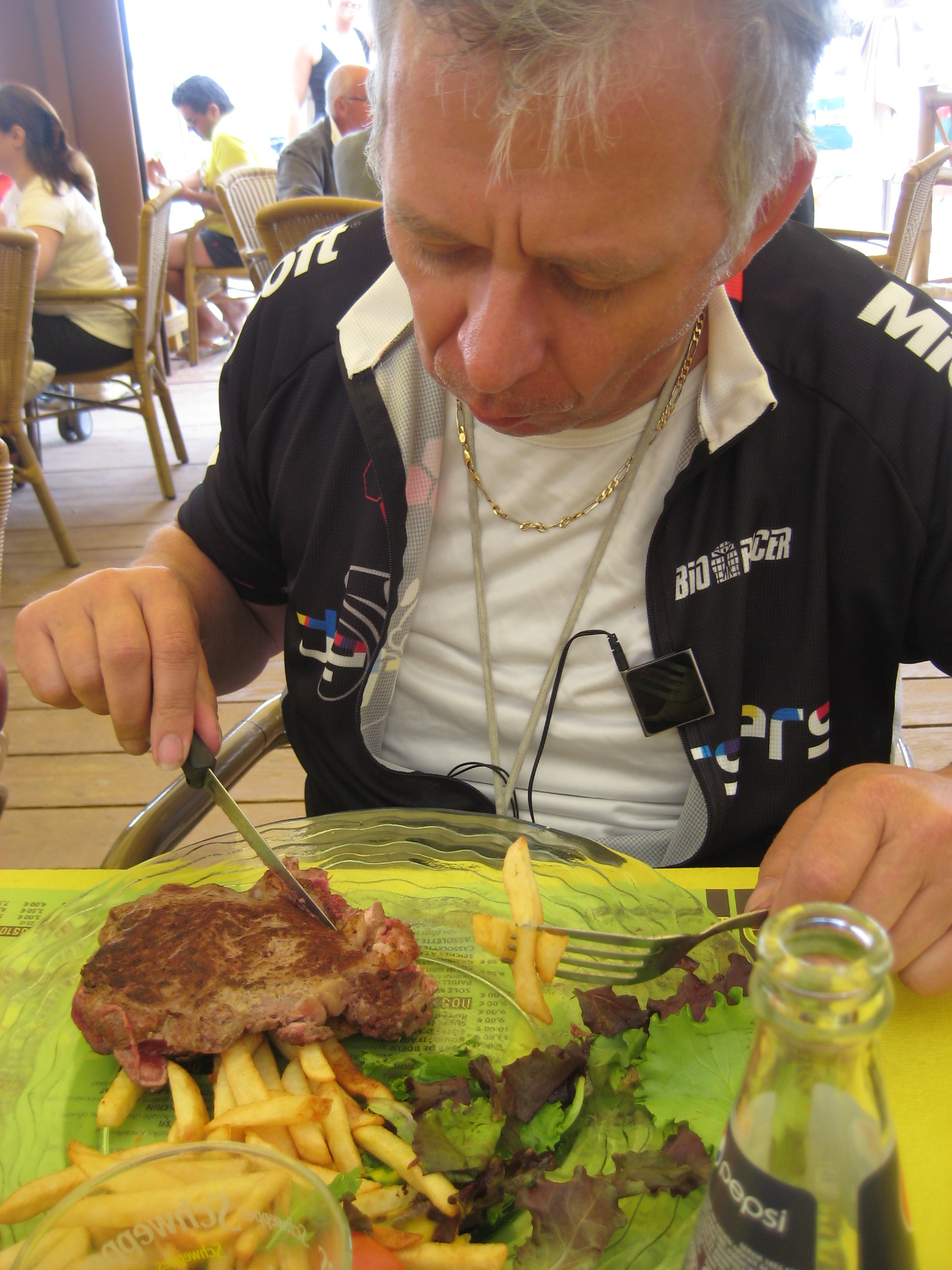 In de Beach Club van Sint Cyprien Plage een terraske gevonden voor de lunch. De echten (Leo, Rudi en Henk) aten een entrecôte met frietjes…