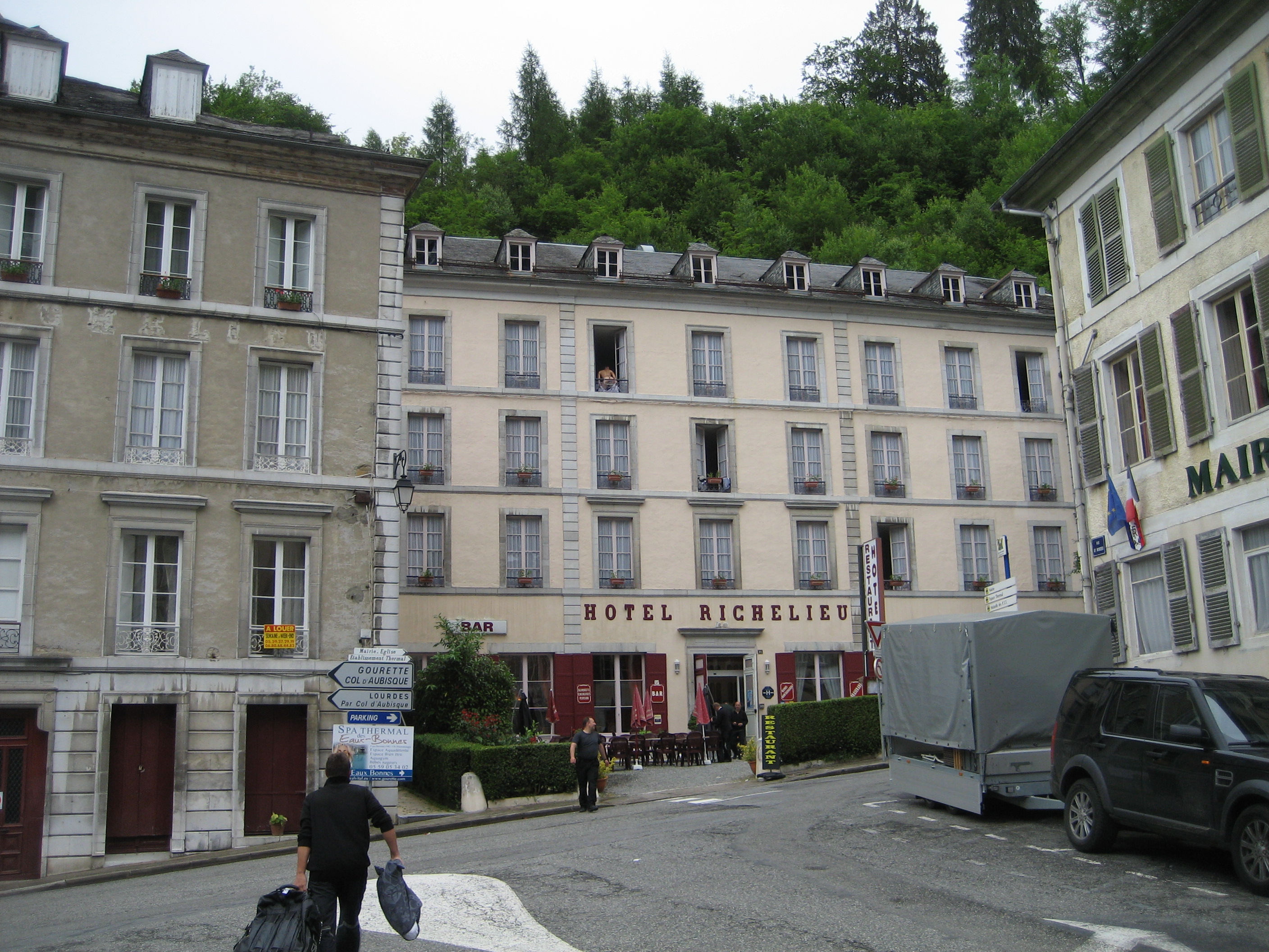 We dalen af langs alweer kiezelbanen naar het alleraardigst Hotel Richelieu in Bonne Eaux, eens een heel rijk dorp met enorme prachtige hotels (hotel des Princes) en een schitterend Casino dat ook al enkele jaren dicht is. De thermen zijn wel vernieuwd, maar het is onwezelijk hoe deze culturele zij het bourgeois site zo vergaan is. ‘Une catastrophe’ zegt de plaatselijke neringdoenster. Benieuwd of de zware bergrit van morgen ook een catastrophe wordt.