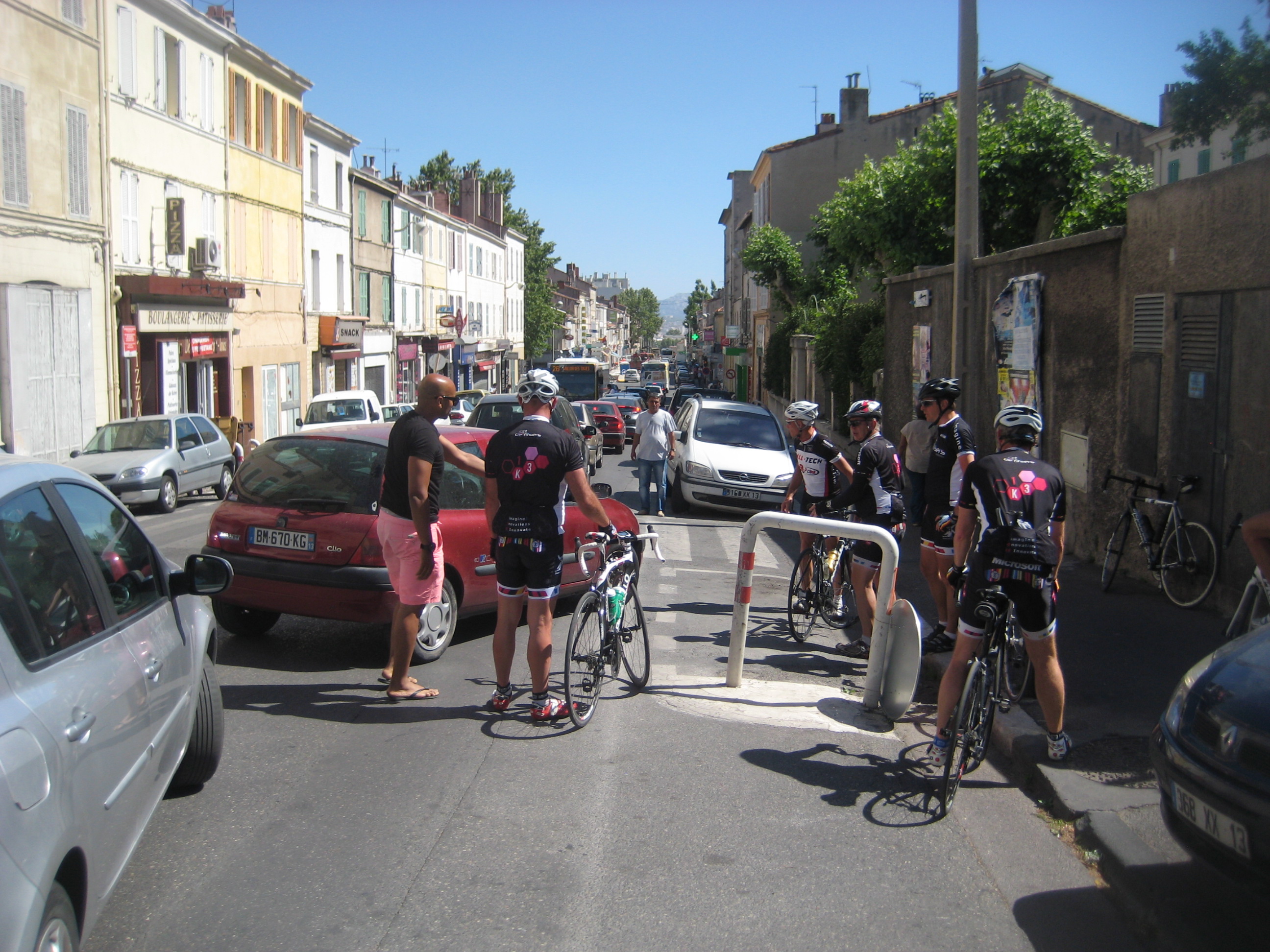 De laatste 40km naar Marseille, bergaf zogezegd maar meer dan regelmatig is het stevig bijstampen. Eens in Marseille begint de ellende, roodlicht om de tweevoet, overal werken en vuile straten. Der Rudi wordt omvergereden door een kleurling die meent dat dit hier de gewoonte is in Frankrijk (om te parkeren zonder kijken). Gelukkig niet te veel aan de hand.
