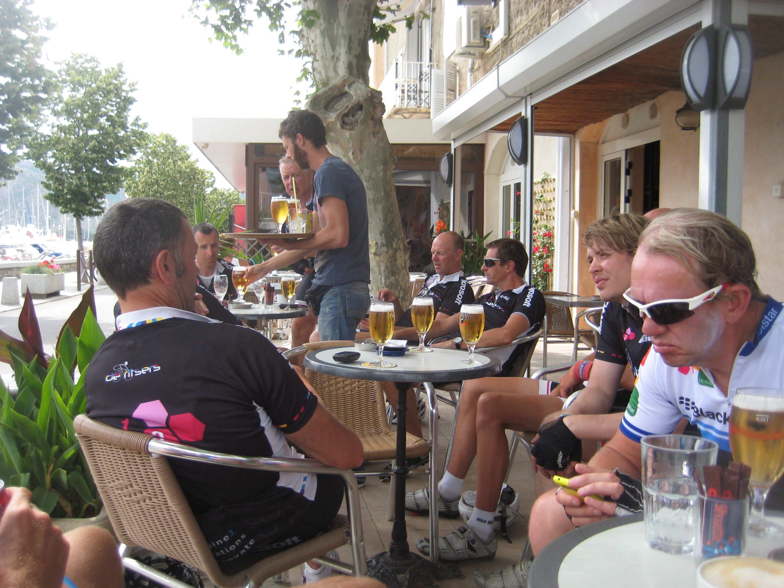 Nog 36km bergaf deze keer, zogezegd. Sommigen beginnen te hallucineren en zien dikke zwijnen langs de weg. De Oost-Vlamingen vlammen als weleer en maken de klus af in iets meer dan een uur. Maar ze missen dan wel een alleraardig terrasje in Saint-Florence, waar we samen een glas drinken op de laatste lange tocht. Dat glas trekken we door tot het hotel La Palma en het tegenoverliggende resto Le Rond Point waar de pasta stilaan onze oren uitschiet. Het laatste avondmaal allemaal samen. Morgenavond zitten we opnieuw op de boot richting Marseille en den Belgique. Nog es dank aan de organisatoren en assisten van deze onvergetelijke tocht, zeker ook aan Wim en Geert. Diepe buiging voor al jullie tijd en inzet. Morgen naar Bastia voor de eerste rit van de Tour de France.