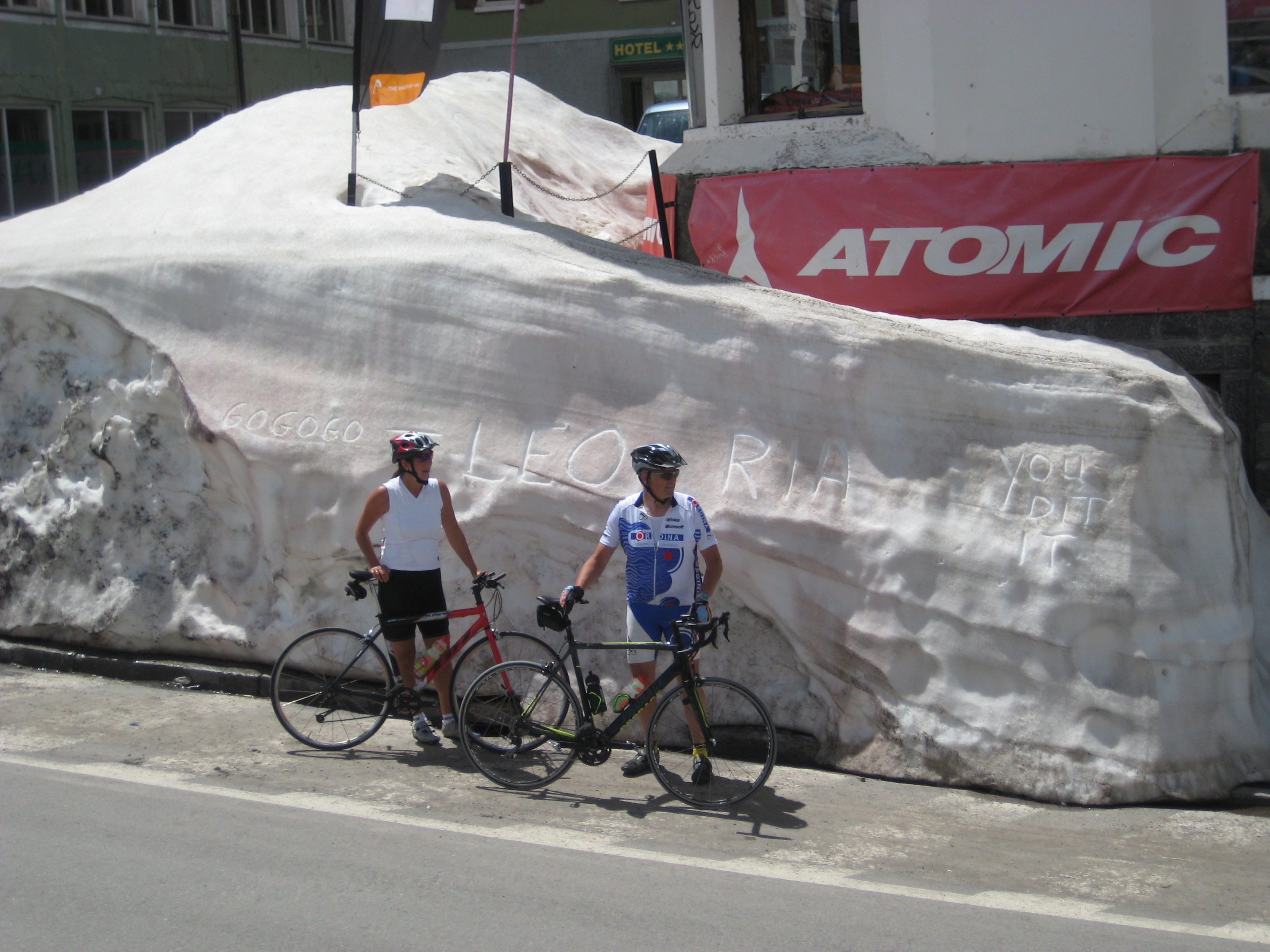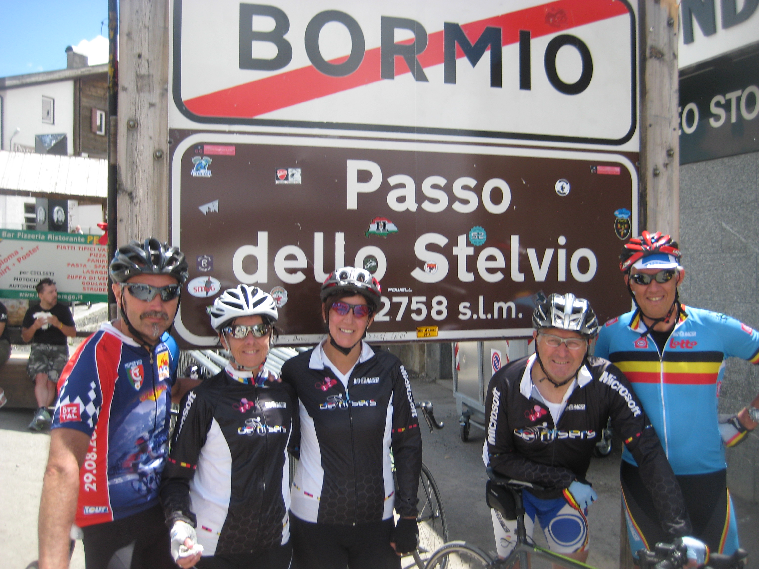Om 10h vertrokken. Het was al warm en weinig wind. Zweten geblazen dus. De eerste kilometers volgden het plan om samen op’t gemak naar boven te rijden. Het duurde niet lang of Ann kreeg vleugels en bepaalde het tempo. Dan maar iedereen op eigen tempo naar boven. De oranje-fluo outfit van Ann was een mooi mikpunt om te volgen… Na 2h15 waren de Charel en Ann boven. Ik 200m later. 45 minuten later zagen we vanop ons zonnig terraske Ria en Leo toekomen. Allemaal moe en voldaan weer naar beneden. IMG_7697Een douchke, samen met Leo onze Stelvio rugzakjes ophalen want de rest van de Ritsers kondigden zich al aan via enkele smsjes. De bus Vlaanders en Hertals waren er snel. Bus Jan de Vos heeft een half uurke in Bormio rondgereden voor ze uiteindelijk het hotel hadden gevonden.