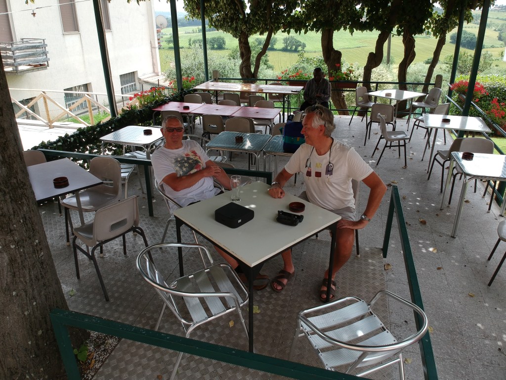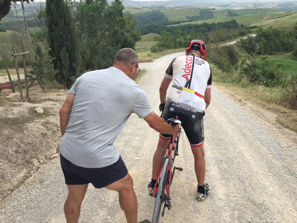 Van La Casetta naar Casa Astrid, lichtjes beneveld en dus niet te warm, maar wat een onwaarschijnlijk pittige rit van ruim 165km en 2400 hoogtemeters. Stradi bianchi op het programma en sommige kiezen voor een alternatieve route. Fake news, want ook zij moeten 8km over gravel, incluis een ezelspad. Wij gaan wel langs de officiële route maar deze onfortuinlijke croniqueur begeeft zich in het spoor van Kim die in de afdaling losse steentjes opzoekt, net een val ontwijkt, maar ik ga wel tegen de grond, netjes gefilmd door onze grote lijder. Enkele schaafwonden toch en verder met de billen dicht over de stradi. Op het grote tandwiel kunnen we niet, maar gelukkig hebben we goede mecaniciens mee, de twee ansen, Hans en Frans. Ook een serieuze gaap in de band van Frederik die een reserveband krijgt van Chris. Op naar Montepulciano, een forse klim voor de straffe mannen, Chris, Jo, Kenny, Frans en Paul die vandaag uitstekend zit. Wij klefferen naar boven, ook in het stadscentrum wat nog klauteren is, maar dat was nog niets tegen de exit die 22, 23% was. Dat had Kim goed gezien. Rond km 90 komen beide groepen samen in bar Burino waar Leo een aardig prieeltje gevonden heeft voor de bevoorrading. Ook Frank is de dienstbaarheid in persoon. Henk stapt in de wagen, hij kan het niet meer aan. We rijden samen naar Perugia, zien even de Lago Transimeno, de Kim pitst er 10km af. Frans en Kenny nemen lange stukken kop voor hun rekening. Als het echt steil gaat dan pakken Jo en Chris uit. De Ritsers zijn echter geen cultuurminnaars. We rijden naar Perugia en rijden langs de wallen, nog wat hoogtemeters. We rijden langs Assisi maar we negeren Franciscus. En nu is het echt klefferen naar Casa Astrid, maar het is meer dan de moeite waard: wat een prachtig pand van Jean-Luc Decroo die een ruïne uitgebouwd heeft tot een prachtige villa. Een echte verrassing, met de beste somelier van Umbria in 2013 als de aanbrenger van exquise wijntjes. Het compenseert met de giga-inspanning van vandaag. We hebben ook geluk zegt Jean-Luc, tot 5 dagen geleden was het hier snertweer, met veel regen en overstromingen in Perugia. We zijn opgelucht. Er wacht ons nog een overheerlijk maal. Het wordt een topavond.