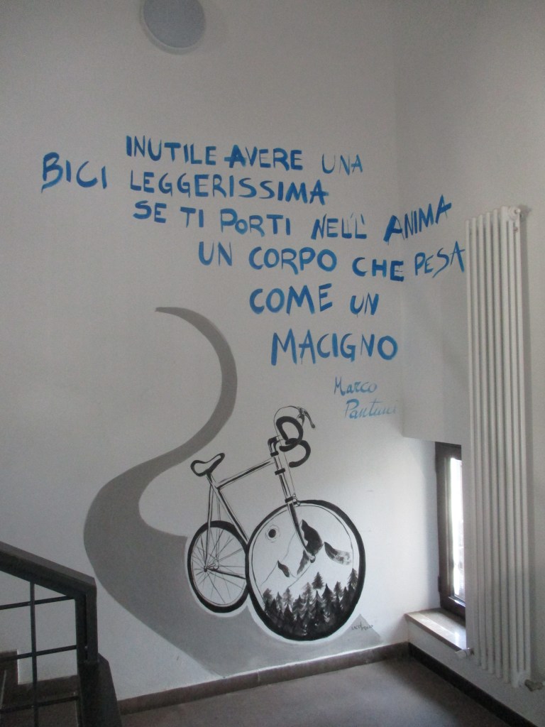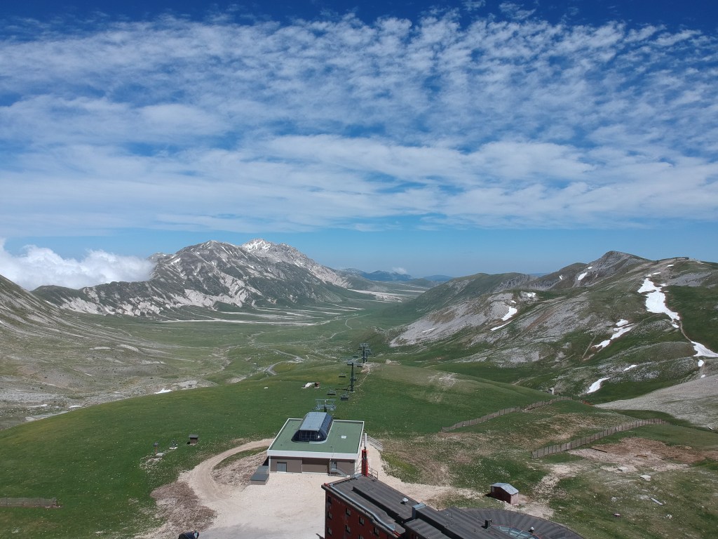 Henk en ik waren al weg. Henk laat me eerst spelenderwijs wat voorsprong nemen maar haalt me dan helemaal bij. Eens op het wondermooie plateau staat de wind gemeen tegen, kilometerslang. Het lijkt wel op de aanvang van de Galibier, zogezegd vals plat, wind tegen, 7 procent. Halfweg zien we een prettig geurende bar, zullen we daar? Nee, nog 400 hoogtemeters tegen zo’n 10%. Er ligt sneeuw langs de kant. Het is zwoegen, zuchten en zweten naar 2.100 meter. Gelukkig wat frisser nu, zowat 20 graden. Boven wacht ons een bord spaghetti. Wat een mens al niet doet voor wat pasta. Maar heerlijk, veel zelfs. Op 6 april 2009, exit 10 jaar geleden vond hier een zware aardbeving plaats met epicentrum in l’Aquila. Daar slapen we vanavond.