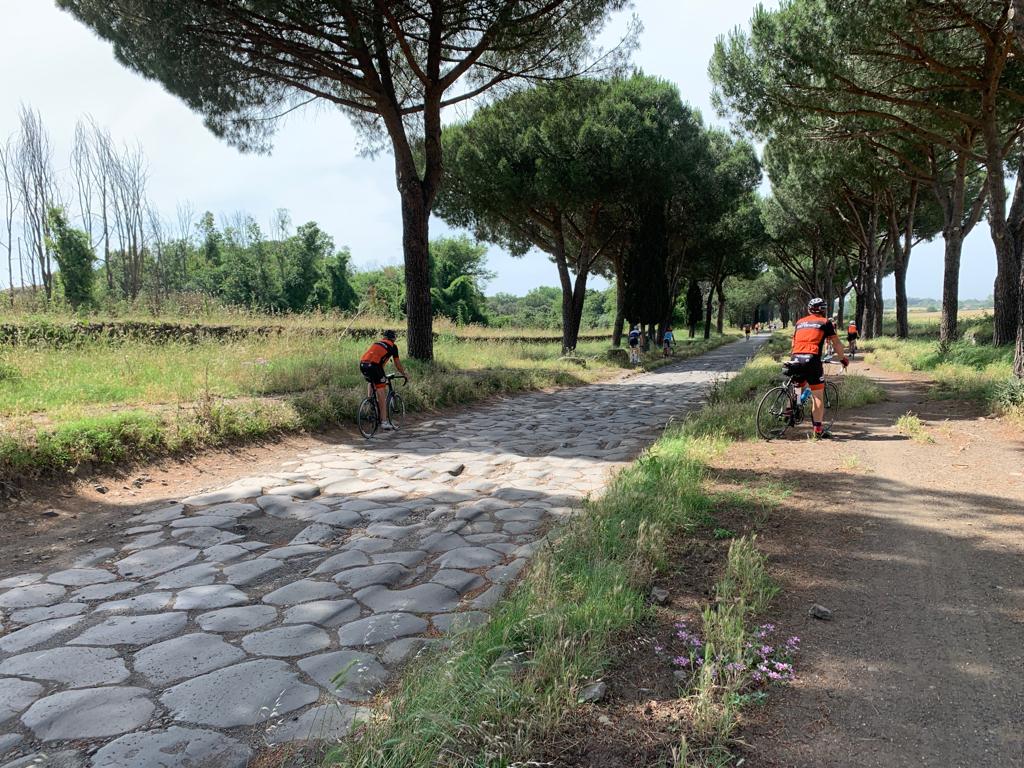 We naderen Rome en iedereen wordt uitgelaten. Alleen de laatste 10km over de kasseitjes van de Via Appia is niet evident. Niet veel wagens, klopt, maar deze chroniqueur rijdt meteen lek (gelukkig geholpen door handige Mark die een band er letterlijk in een handomdraai opnieuw kan opzetten. Langs de catacomben worden we toeterend voorbijgereden door een witte slee met bruidspaar. Onze noorderbuur Chris herkent er koningin Beatrix in.