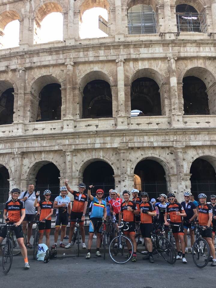 We komen aan de eindstreep, het Colosseum en iedereen valt elkaar in de armen. Leo en Frank hebben bubbels mee wat ook een Russische rondborstige blonde charmeert die met plezier meeviert met haar Mexicaanse vriend. Leutig die laatste uren, zeker omdat Paul alweer een heerlijke suite heeft verzorgd in hotel Mercure met zwembad en bar op de rooftop van de 8steverdieping.