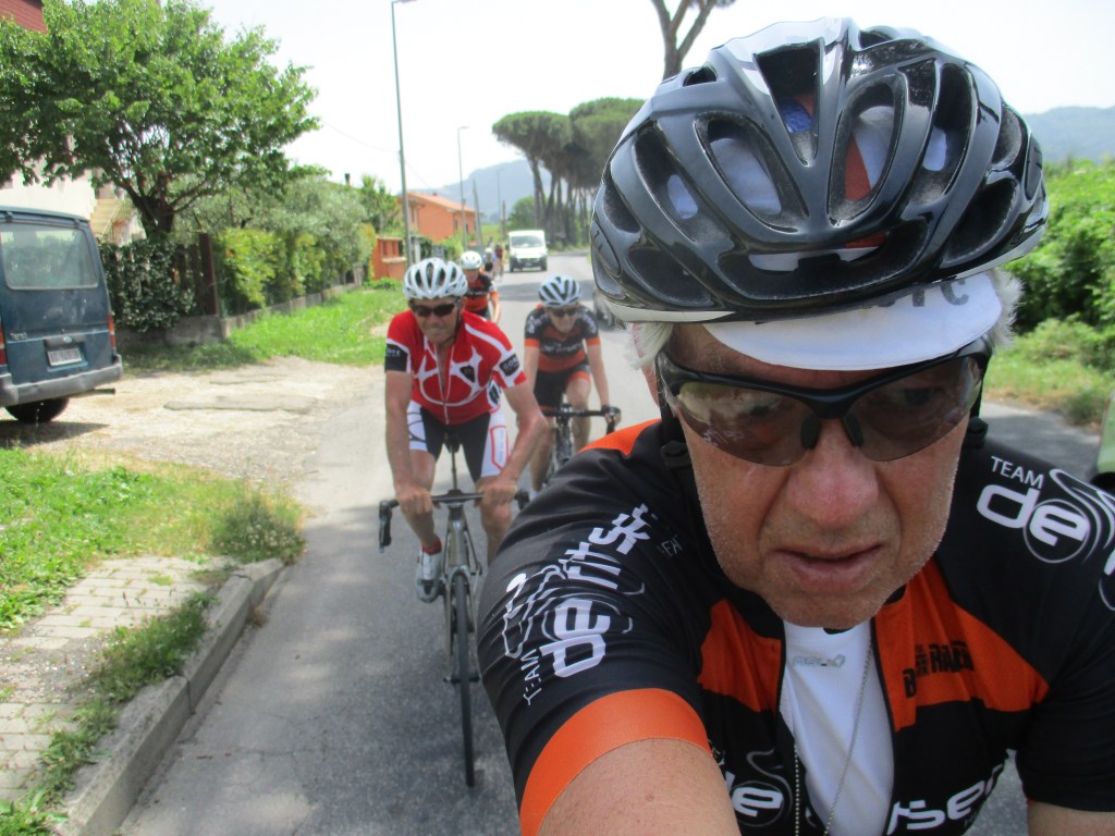 Voor de lunch op km 90 heeft Leo alweer een goede bar gevonden, bij Dany’. Het is opnieuw bloedheet, met temperaturen rond de 35 graden. Met een helling van een paar km voor de boeg vertrekken Fré, Hans en Henk wat vroeger. Ook deze terp valt mee, 4 tot 5 percent. Heerlijk klimmen. Vanaf nu gaat het bergaf. Wel drukker, auto’s toeteren ongeduldig en even lijkt het op een sjacosjengevecht uit te lopen als een dame in een Mercedes uithaalt naar Maritza dat ze de wegcode moet respecteren en uiterst rechts moet rijden. In een ongewoon heftige reactie schreeuwt Maritza terug dat de Italiaanse wegen abominabel zijn. En ze heeft gelijk, maar het was toch even opschrikken voor de groep. Zo hadden we onze straffe madam nog niet gezien (overigens wat een prestatie van Maritza om hier zo goed als de hele route uit te rijden).