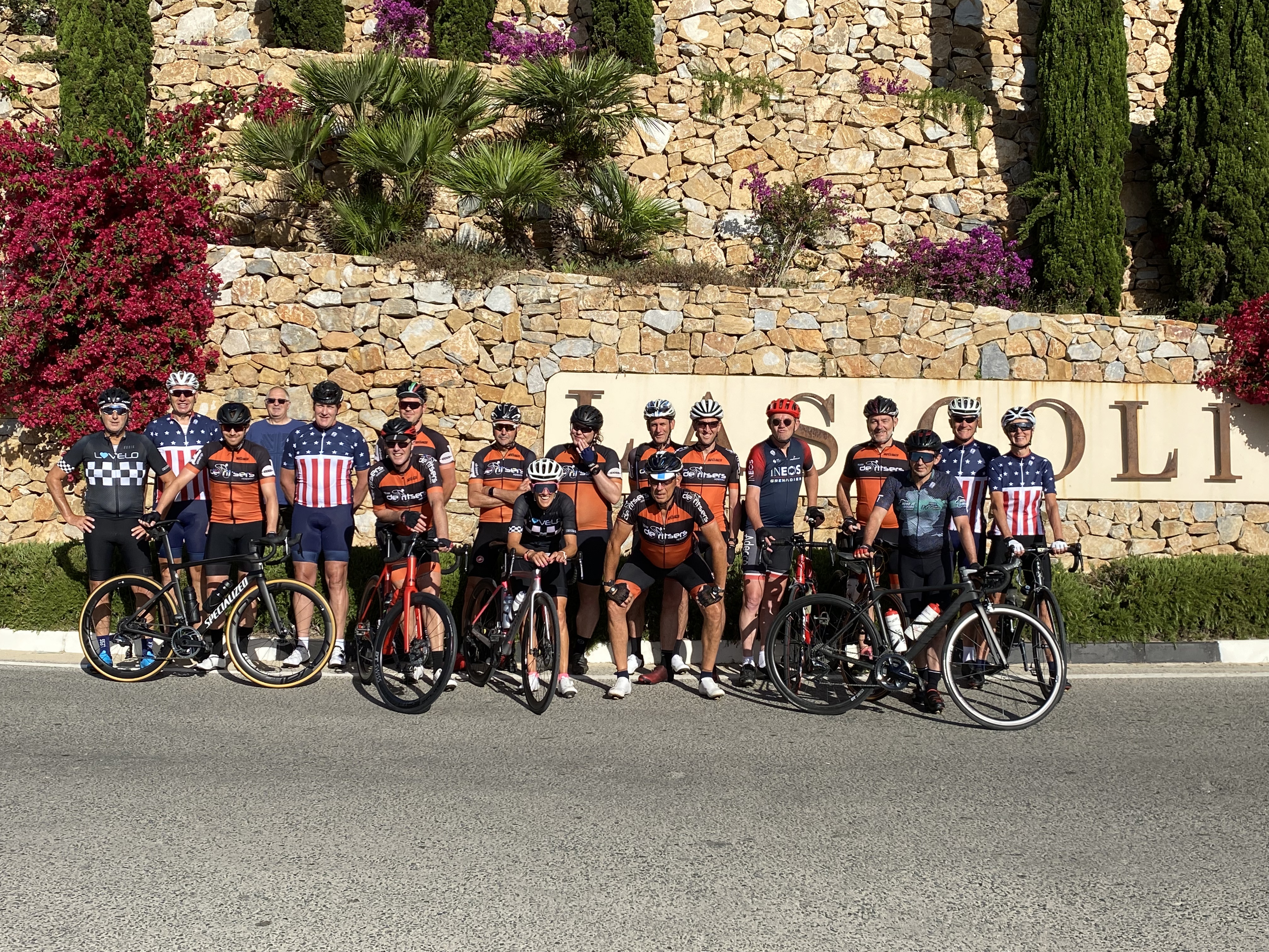 Een schare fans deed ons uitgeleide aan de voet van Las Colinas waar we samentroepten voor de familiefoto. Het was wel nog wachten op de grote leider, Hans. Die had van de stress zijn drinkebussen vergeten (de Kempenzonen steken altijd een ‘e’ tussen drinken en bussen). Op de eerste helling had de locale prostituee (die er vaak halfweg ontvangt) trouwens geen zondagdienst. Op naar de Rebate, een mooie slingerende baan met heel wat terpen. Sommige benen kriebelen, ze fladderen naar boven. Het is nog geen 10 uur en het is al 27 graden. Dat belooft. Van het oorspronkelijke ‘toeristenritje’ van 132km blijft ook niets over. Het worden er 140 met ruim 1.500 hoogtemeters naar Jumilla. Ook dat belooft. Vader en zoon Van Peer nemen na de Rebate de kop, mooi familieduo. Daarna zag ik twee beren samen de kop nemen. Kris en Jan, beiden een slordige twee meter, trekken ons op touw tot de eerste bevoorrading van nonkel Leo, lekker in de lommerte. De dames Maritza en Marleen gaan bij de bakker aankloppen voor een kleine behoefte. De panadero laat hen gewillig binnen…