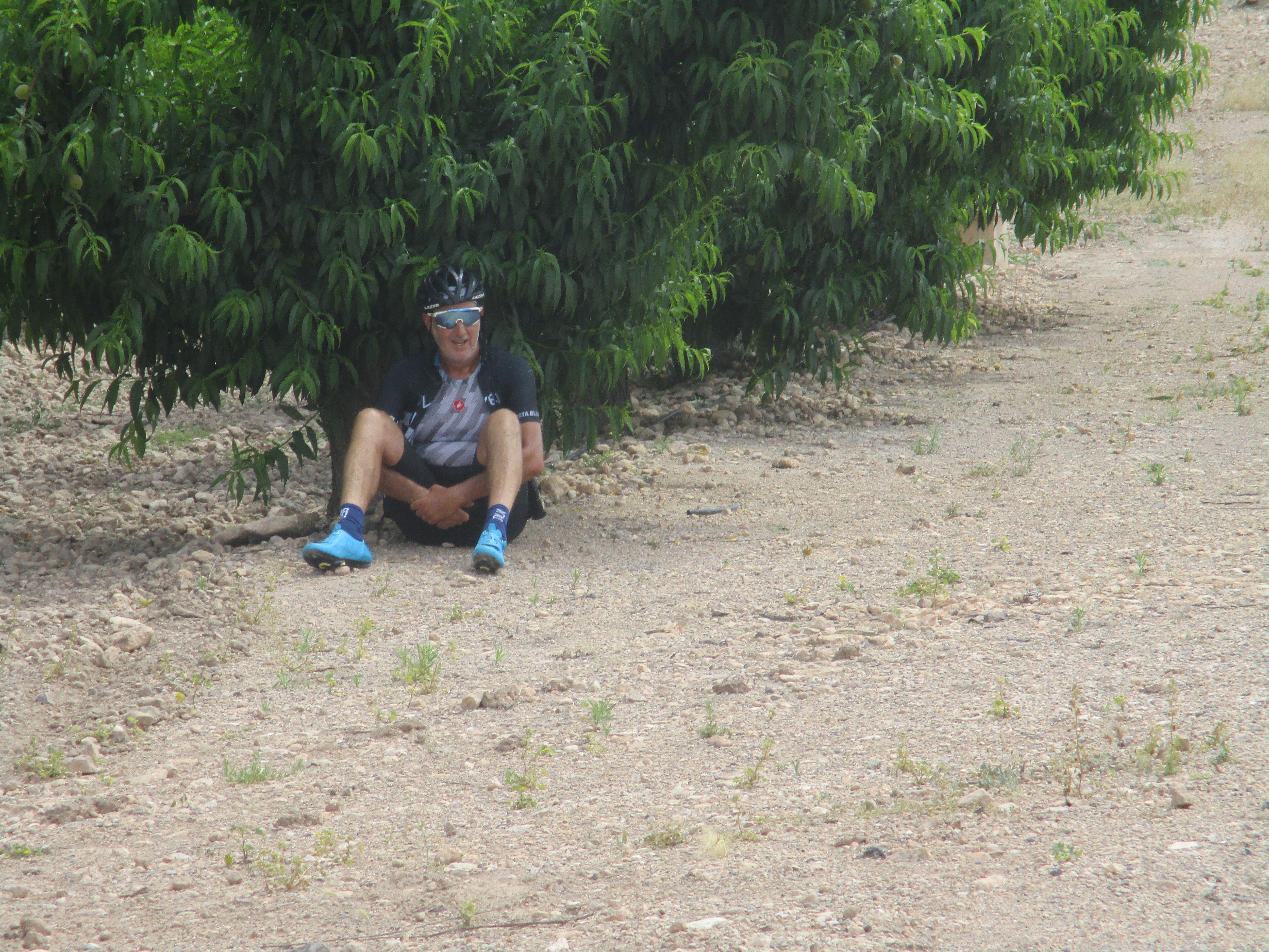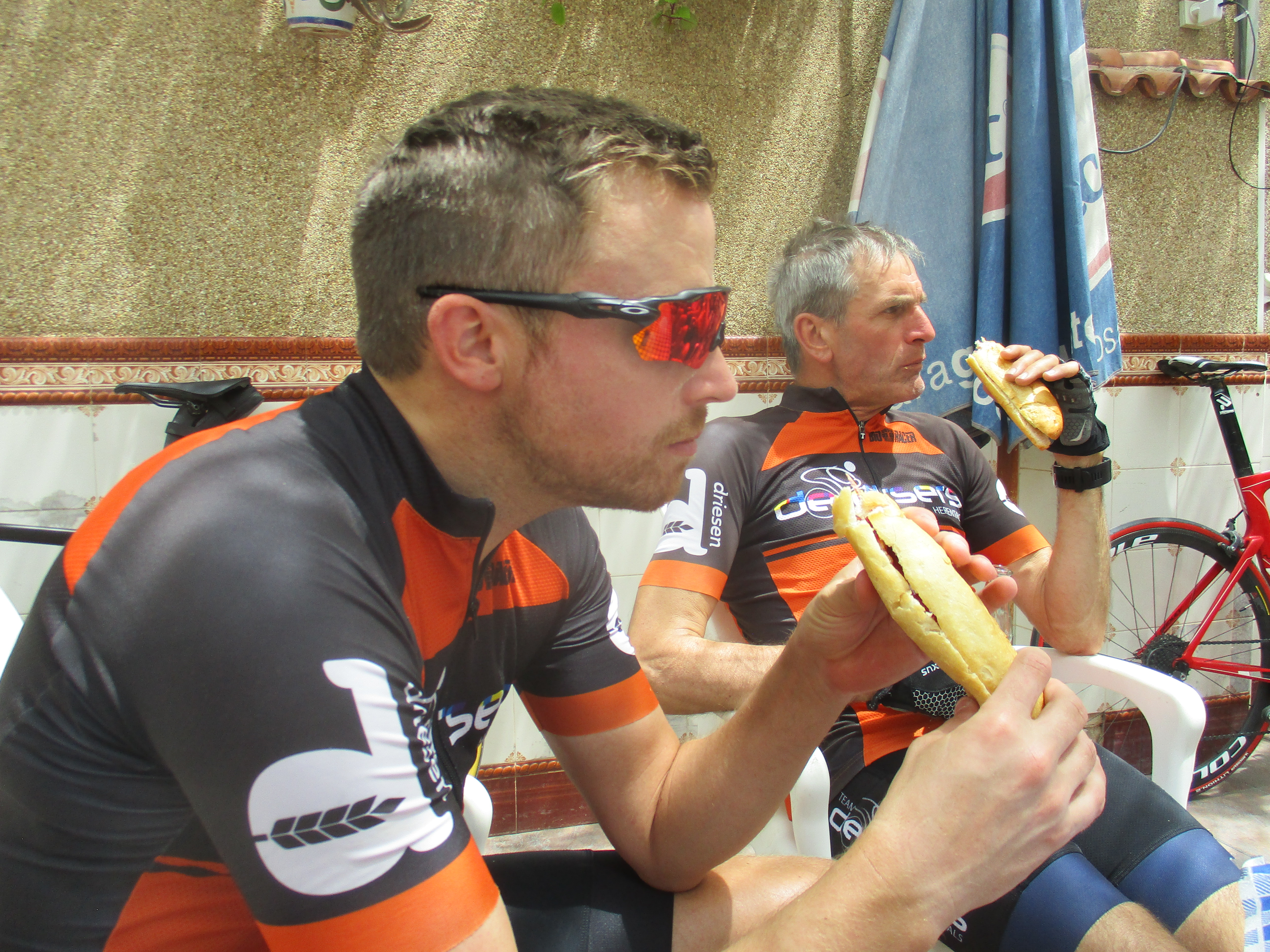 De temperatuur is inmiddels opgelopen tot ruim 30 graden. Het is wat taffelen in Murcia met veel korte bochten en enige drukte, maar voor het eerst is er geen gemor over welke weg de GPS nu precies aanduidt. Jo en Mark kwijten zich goed van hun taak en loodsen ons door de drukke stad. Een aardige fietsweg leidt ons verder naar Archena, waar nonkel Leo alweer een schitterend terrasje met veel schaduw heeft aangetroffen, weliswaar in een wat groezelige ‘Bar Doremas’ waar sigarettenrokende mannen met open hemd bij elkaar hokken rond een fles wihiskey. De waard is ons echter heel gewillig. Even is er paniek toen er plots geen worstjes waren om in onze baguette te droppen, maar ook hier was nonkel Leo weer de toeverlaat die nieuwe worstjes opdiepte uit het diepvriesvak.