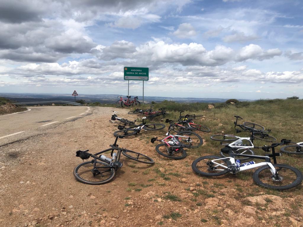 Het ergste is achter de rug: nog zo’n 70km bergaf tot de Paradores in Alcañiz. De twee beren, Jan en Kris, zetten zich op kop en gezwind zoeft de grupetto naar de eindstreep. Tot de guardia civil ons aan de kant zet. Dat we naast elkaar moeten rijden, niet met z’n drieën, dat hij anders iedereen op de bon smijt: 200 euro aub. Gedwee, twee aan twee, rijden we verder, terwijl Frank aanduidingen blijft schreeuwen, dat we meer rechts moeten bollen. Tevergeefs ook aan de Grote Leider die graag de middle of the road opzoekt. Lekke band voor Maritza. Willie verliest z’n pedalen, enfin, eentje toch bij de bevoorrading. Mark is erbij en het euvel is dus zoals steeds snel opgelost.