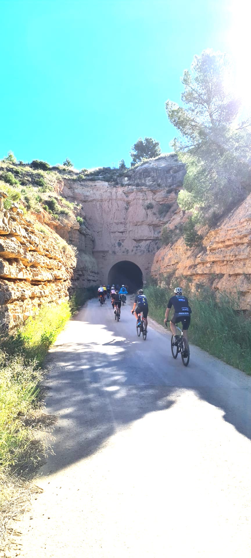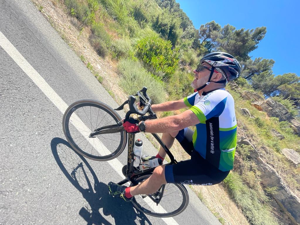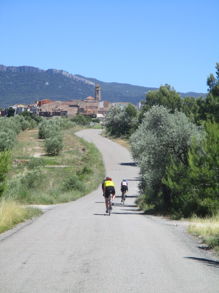 Daarna gaat het openaf, meer af dan op, met ellenlange afdalingen, netjes twee aan twee, met wind mee. Een recupritje van 110 km en 1.400 hm richting Falset… We zitten bijna een uur voor op het schema. Onderweg overschrijden we de Greenwich meridiaan, halfweg komen we aan in de provincie Catalunya en zoeven we langs de wijnranken. Jan heeft wat problemen met z’n fiets en kan het in het afdalen amper in bedwang houden, terwijl hij net zo graaf afdaalt…
