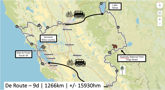 De eerste plannen werden al gesmeed in 2014, concreet werd het pas in 2019 en we boekten onze vluchten in 2020. Maar toen was er Corona… Na 3 jaar uitstel op een rij gaat het nu eindelijk gebeuren. 18 Ritsers gaan in 2023 voor de eerste maal fietsen in de USA! We vertrekken over de beroemde Golden gate Bridge, fietsen door het unieke decor van de Sanoma wijnstreek, laten ons afzetten in het fietsparadijs rond Lake Tahoe om vervolgens af te zakken naar een van de mooiste natuurgebieden ter wereld: Yosemite National Park waar we via de bekende Tioga Road op 3000m hoogte door sneeuwmuren bear country doorkruisen, tenminste als de sneeuw wil smelten tegen eind mei… en eindigen tussen de Sequoia bomen. Het wordt een prachtige tocht. San Francisco, here we come!