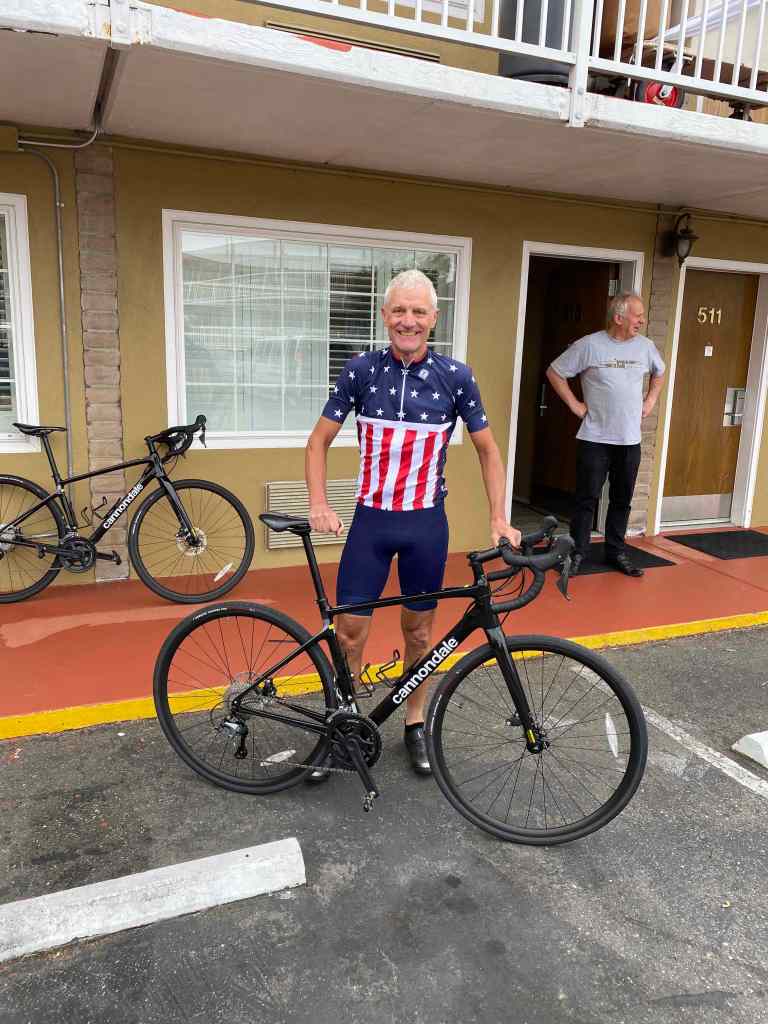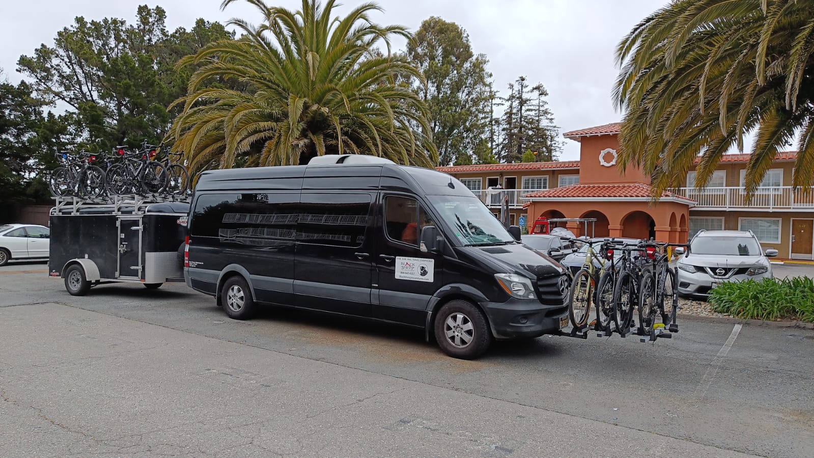 ´De fietsen zijn er´ schreeuwt Willy, en inderdaad, de zwarte bus met trailer en 4 fietsen op de voorste bumper staat op de parking van het hotel. Aan boord: 16 spiksplinternieuwe Cannondales. Na wat gesleutel met pedalen en zadels worden deze bolides klaar gemaakt voor de strijd. Morgen begint eindelijk onze tocht!
