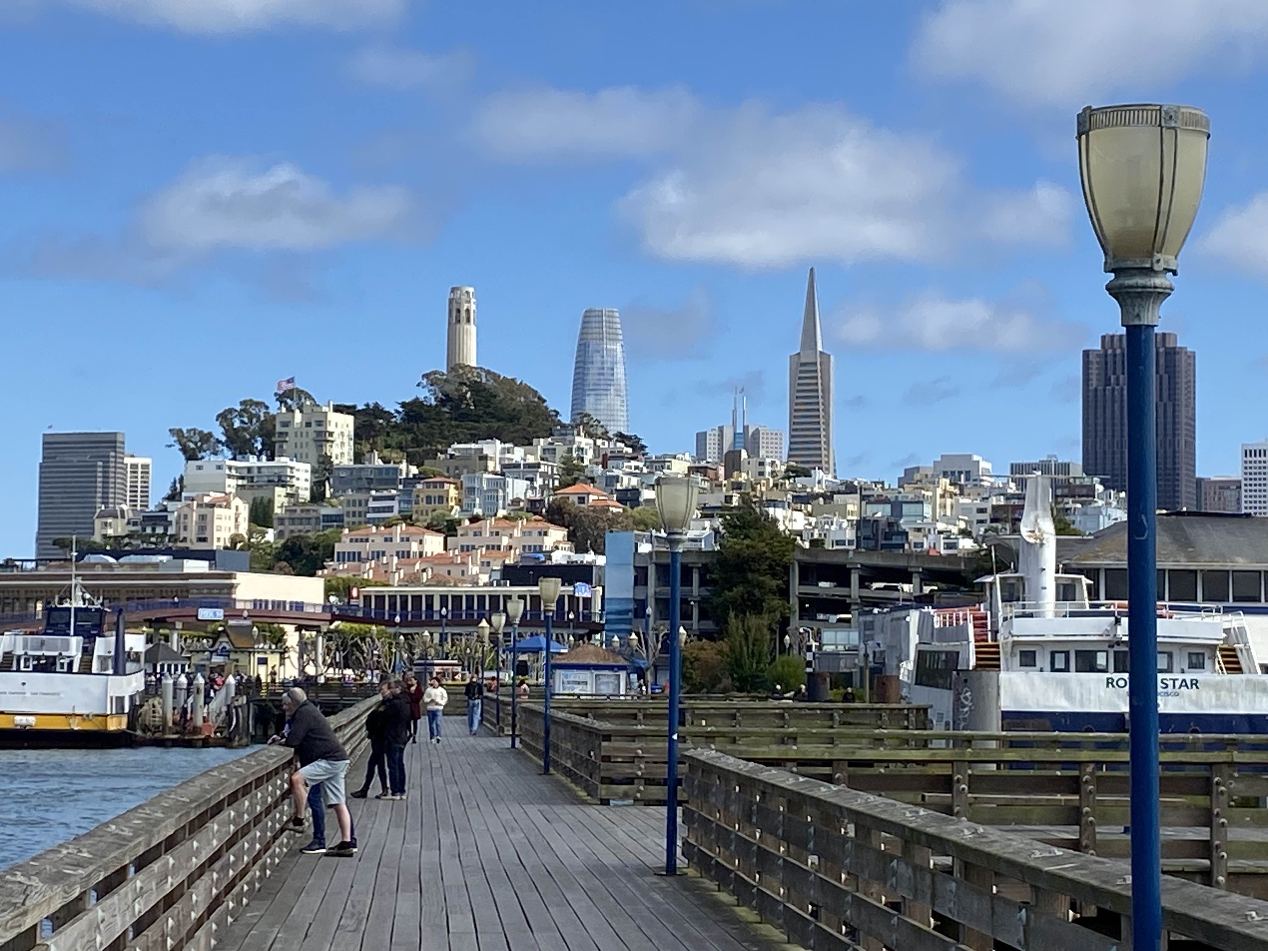 ´12u verzamelen voor vertrek naar SF´ rinkelt het California2023 WhatsApp-berichtje van Hans. Een rammelende wagon en 5,2 dollar armer brengt de BART-trein ons van Millbrae naar station Embarcadero, hartje toeristisch San Francisco. We wandelen tussen de imposante buildings en door China Town, en belanden in het tweede Italiaans restaurant op twee dagen. Alle pizza´s op de kaart moeten er aan geloven. Waar blijven de Amerikaanse hamburgers?Fisherman´s Wharf met de befaamde Pier 39 is het volgende doel. Een prachtig zicht op San Francisco Bay ontvouwt zich voor ons. Er wordt gretig gefilmd en foto´s genomen van de tientallen zeeleeuwen op de pontons en het eiland Alcatraz. In de verte zien we de Golden Gate Bridge, het eerste obstakel dat we morgen moeten trotseren.