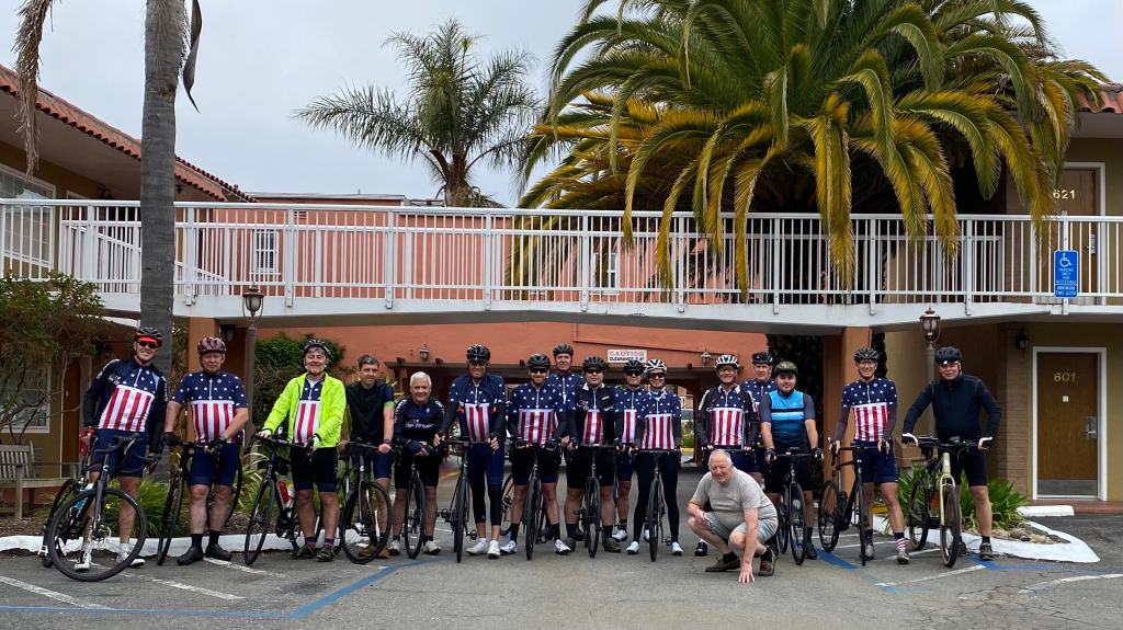 Het begon allemaal vrolijk met een groepsfoto onder de palmbomen van El Rancho Inn. Iedereen blij dat we konden vertrekken. Netjes in groep over El Camino Real. Het werd al snel uitdagend wanneer we de hoofdbaan verlaten richting de oceaan en de Golden Gate bridge. “Nepekes” van bijna 20% sloeg de groep uit elkaar. De zichten over San Francisco zijn prachtig. Op de weg langs de oceaan hergroeperen we en vervolgens rijden we in perfecte Ritsers-formatie richting de rode brug. Onze stars-and-stripes truitjes vallen in de smaak bij de Amerikanen die ons in dit Memorial Day weekend regelmatig hartelijk begroeten en toejuichen.