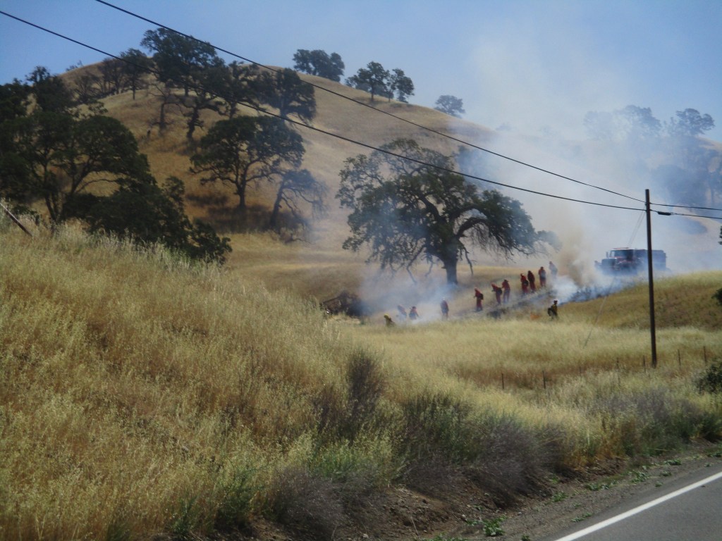 Het eerste klimmetje komt al na 8km. In het begin zien we nog wijnranken, maar als snel komen we in een desolaat maar mooi natuurgebied. We rijden richting Glory Hole waar we onze eerste bevoorradingstop doen. In de afdaling achter een bocht moet Kenny vol in de remmen voor overstekend wild. Wat verder zien we overal zwart geblakerde bomen. Het is hier dat 2 jaar geleden grote bosbranden woedden, maar de natuur is zich al aan het herstellen. Plots zien we in de verte veel rook. Jawel, het is weer zover. Minstens 100 fireman zijn uitgerukt om een beginnende brand onder controle te krijgen.