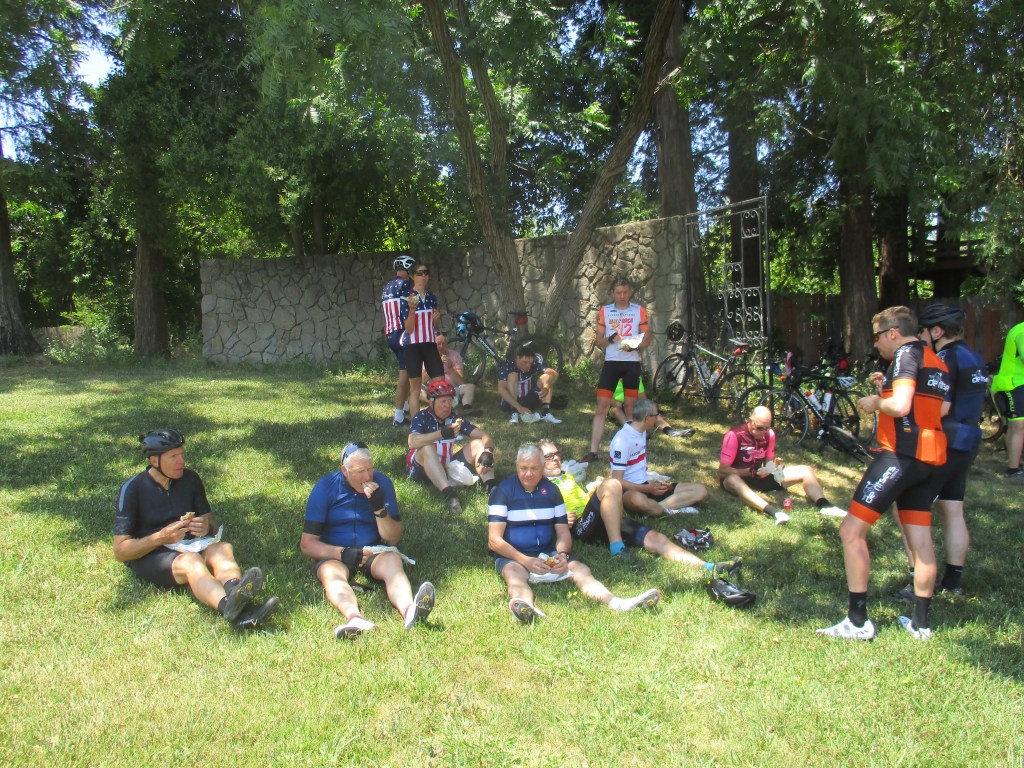 Eens de laatste klimmetjes achter de kiezen gaat het vlot. Met Kenny op kop gaat de beuk er in. Didier met zijn elektrische fiets die maar tot 20 mi/h ondersteuning biedt moet zijn tenen uitkuisen. We zijn al snel Leo voorbij die onderweg ook nog de inkopen moet doen. Op 80km strijken we neer in de schaduw van een grote eik. Enkele minuten later is Leo er met de sandwiches. Jan durft zijn ogen niet sluiten want dan wordt hij niet meer wakker zegt hij. De derailleur van Jan zijn fiets heeft al enkele dagen problemen en hij kan niet op de 32 rijden. Morgen krijgt hij een nieuwe fiets.