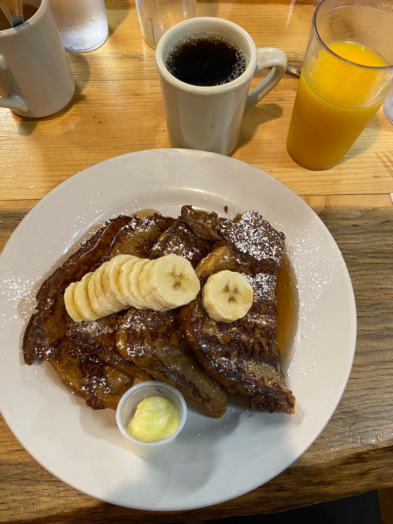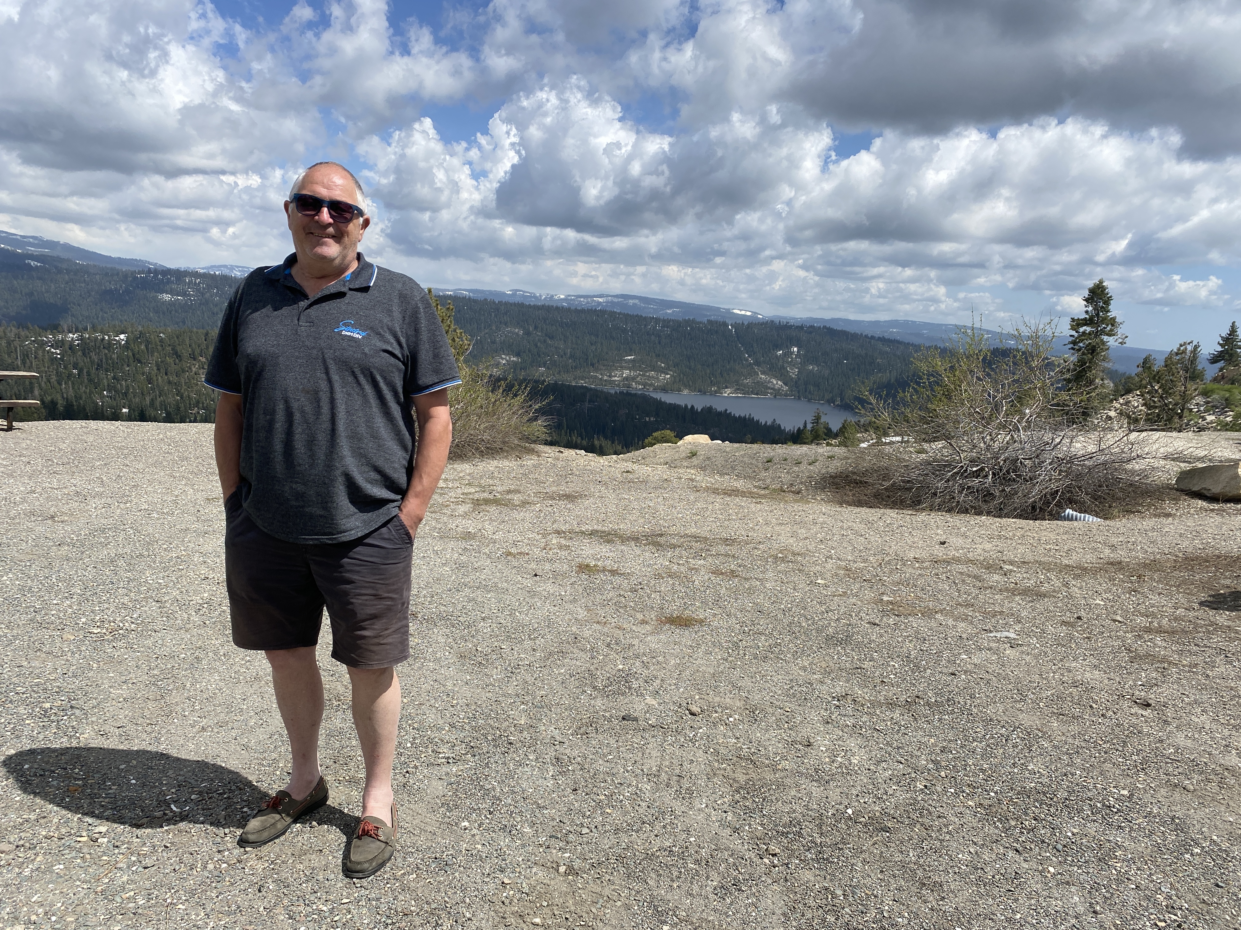 Vanochtend ontwaken we met volle zon op het binnenplein van Hotel Becket. Het wordt weer een schitterende dag. Maar eerst ontbijt in het nabijgelegen Driftwood Café. Ze deden speciaal wat vroeger open voor ons. Jan gaat resoluut voor de French Toast, dat had hem gisteren goed geholpen op de fiets. Een aantal volgen, sommigen met extra banaan. Die zal nodig zijn voor de aangekondigde hoogtemeters. Bovendien gaan we naar het dak van onze tocht op 2.650m.