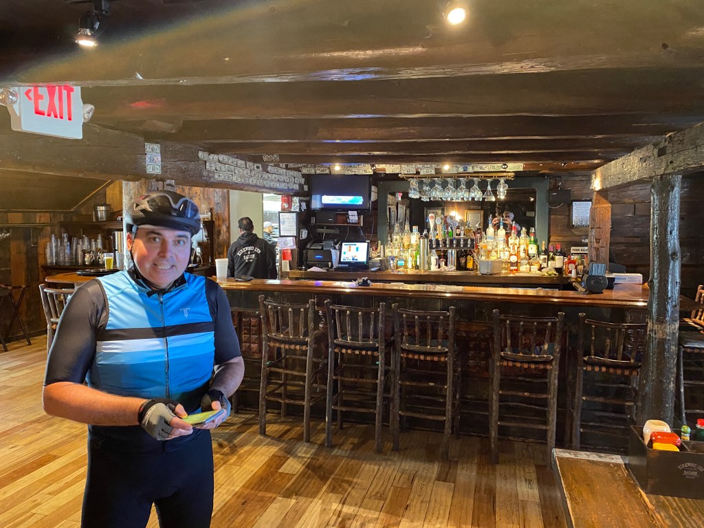 Op de top van de laatste grote klim staat Leo. Hij heeft iets gezien waar we kunnen eten in Kirckwood. We dalen af langs de flanken van een groot bevroren meer. Spectalulair! En inderdaad, na 10km zien we de Kirckwood Inn, een soort saloon in the middle of nowhere. Als we binnen stappen wanen we ons weeral in een andere wereld. Maar, waar er lekkere hamburgens en wraps te kijgen zijn. We overvallen de keuken met onze groep van 17 en er loopt wel eea mis met de bestellingen. “I’m sorry for that” hoor je vaak in Amerika. Ik zit met mijn rug vlak bij de open haard en doe even een powernap. Lekker! /en daar worden natuurlijk foto’s van gemaakt…