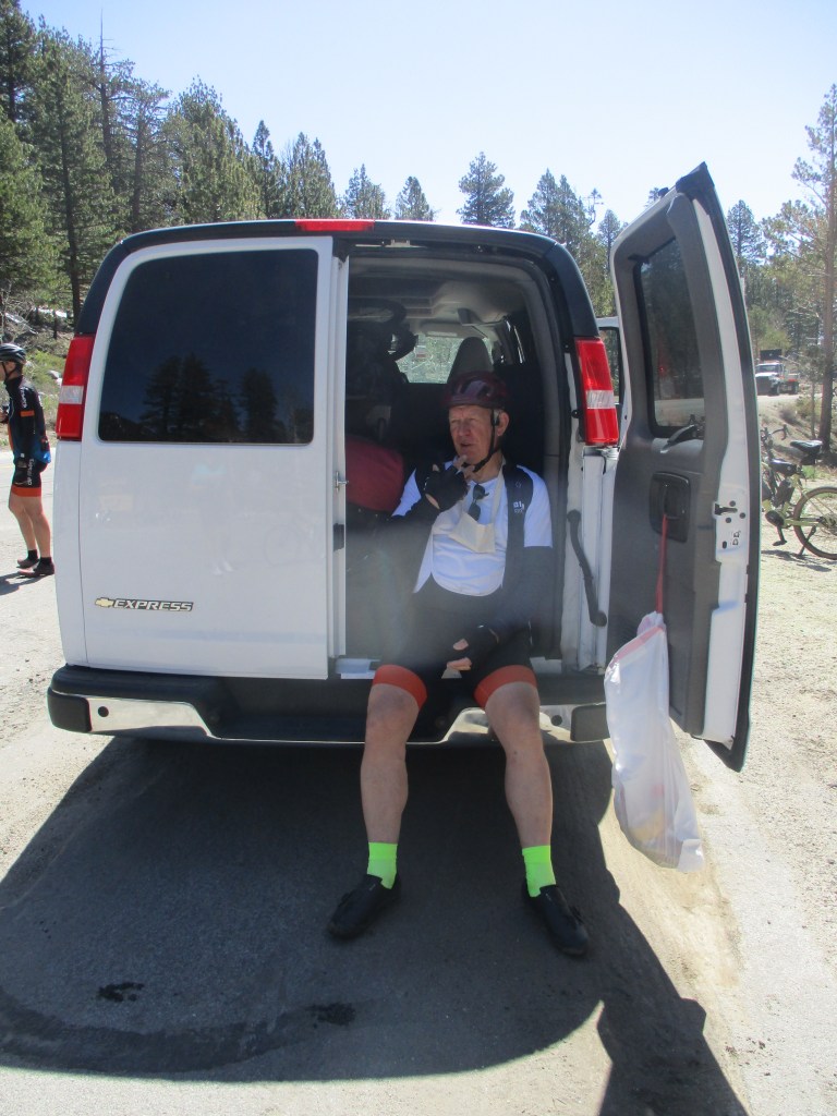 Op de eerste klim is de weg serieus gehavend en is het laveren tussen de putten. We rijden nu echt door de wilderness. Hier is niets dan ongelooflijk mooie natuur en wilde dieren. Geen huis te bespeuren, nergens GSM verbinding en vooral geen Safeway voor onze dagenlijkse sandwiches. De meesten voelen dat we op hoogte rijden, minder zuurstof maar goed voor de rode bloedlichaampjes en de form. Bij de stop zie ik Rudi zitten in de koffer van de Van. Hij is een beetje hoogteziek. De klim naar het hoogste punt hakt er in. En het is nog niet de laatste. Het is al bijna middag en er moet nog veel gefietst worden.