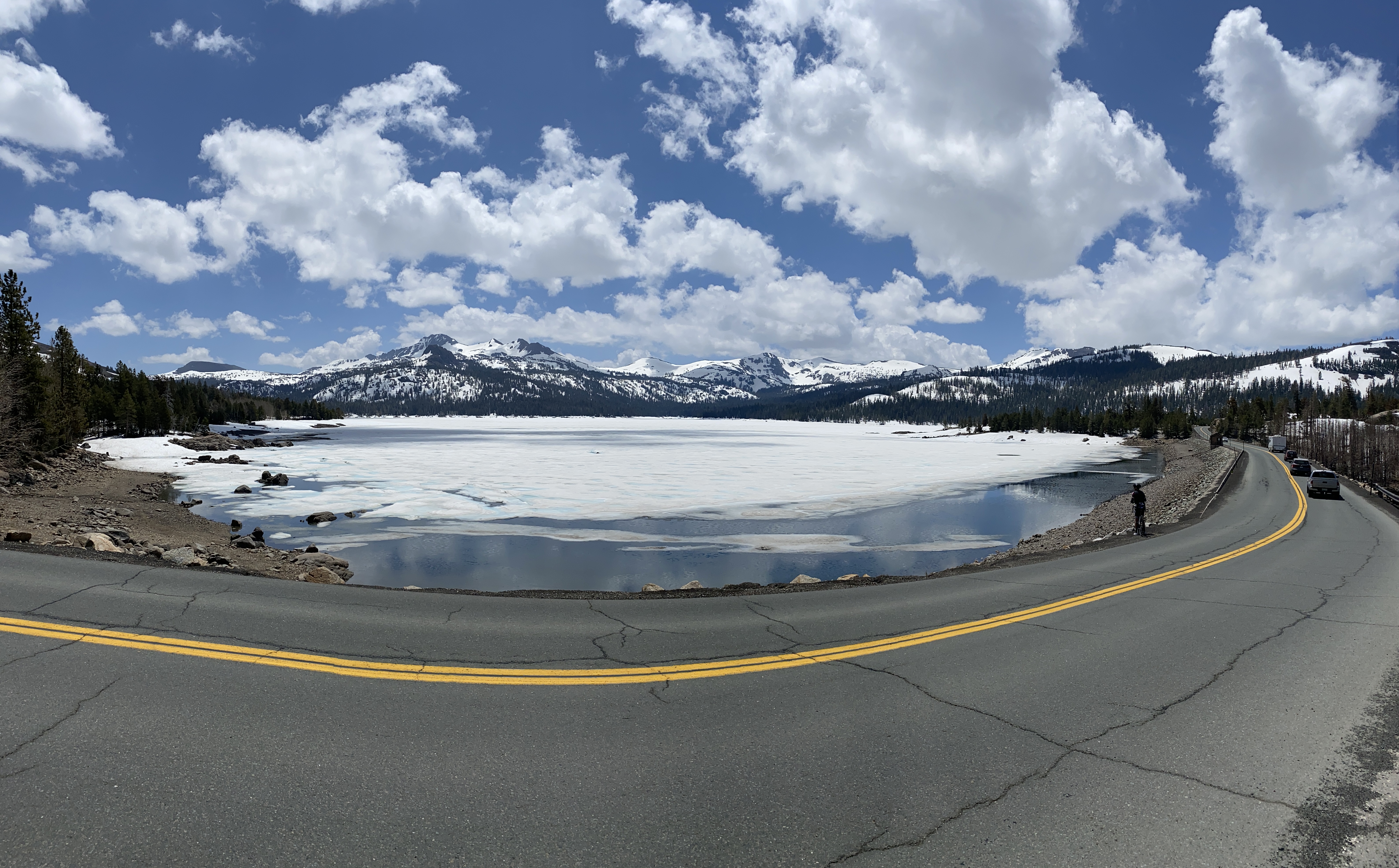 Op de top van de laatste grote klim staat Leo. Hij heeft iets gezien waar we kunnen eten in Kirckwood. We dalen af langs de flanken van een groot bevroren meer. Spectalulair! En inderdaad, na 10km zien we de Kirckwood Inn, een soort saloon in the middle of nowhere. Als we binnen stappen wanen we ons weeral in een andere wereld. Maar, waar er lekkere hamburgens en wraps te kijgen zijn. We overvallen de keuken met onze groep van 17 en er loopt wel eea mis met de bestellingen. “I’m sorry for that” hoor je vaak in Amerika. Ik zit met mijn rug vlak bij de open haard en doe even een powernap. Lekker! /en daar worden natuurlijk foto’s van gemaakt…