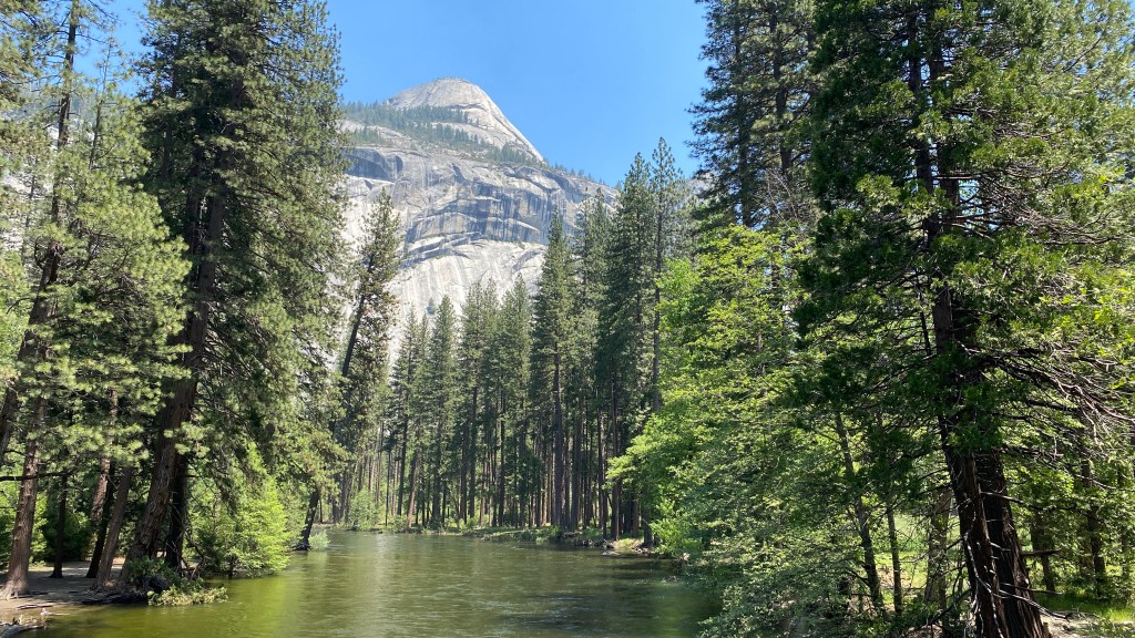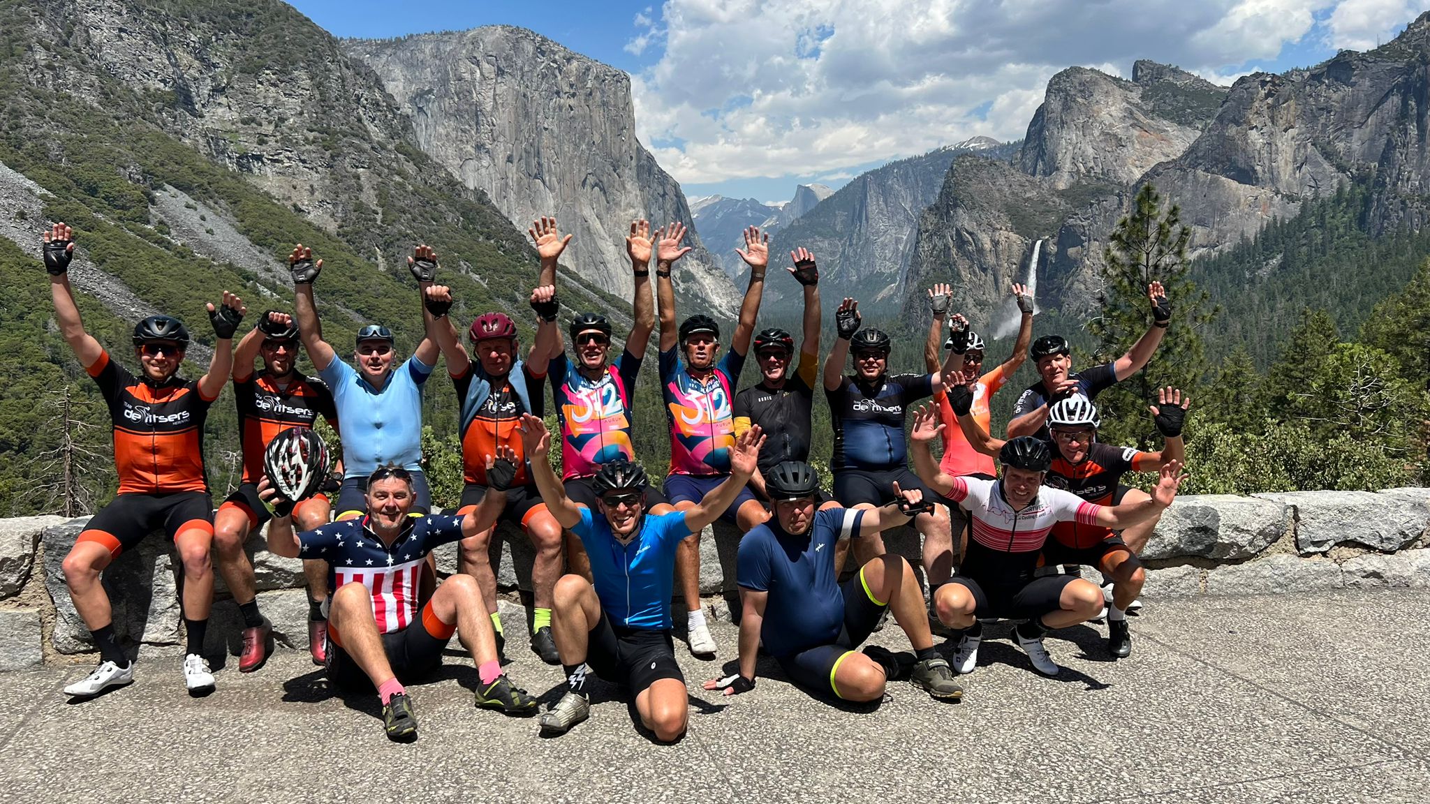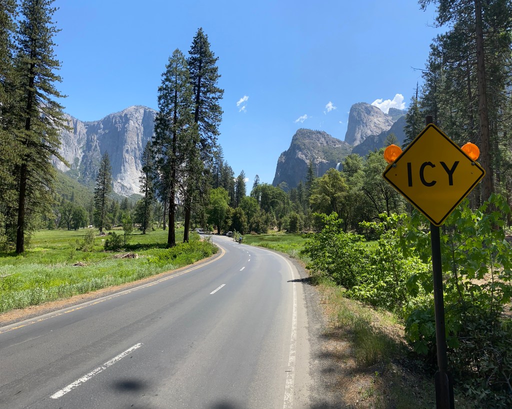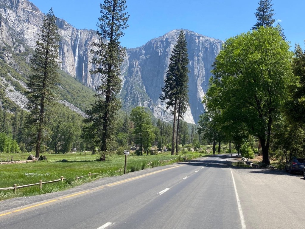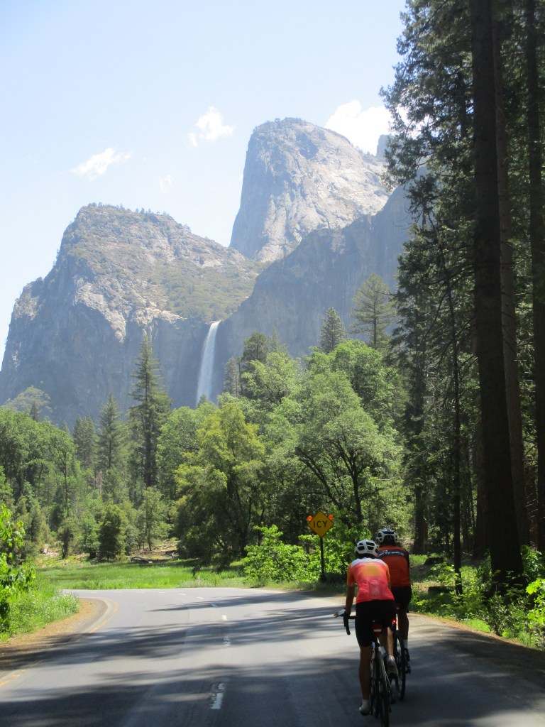 Aangekomen bij de ingang van het park hergroeperen we en betaal ik de entry fee voor iedereen, 20$ per cyclist. Twee vrouwelijke park rangers laten elke auto individueel betalen, met pin code. Het gaat niet snel, dat verklaart de lange rij. Als ik vraag naar de drukte zegt ze “Yeeeh, it’s brutal today” en geeft me voorang. Achter de eerste bocht verschijnt al direct een wondermooie postkaart. Onze monden vallen weeral open. We rijden langs spectaculaire watervallen en zien in de verte alle landmarks liggen: El Capitan, Yosemite Falls en the Half Dome.
