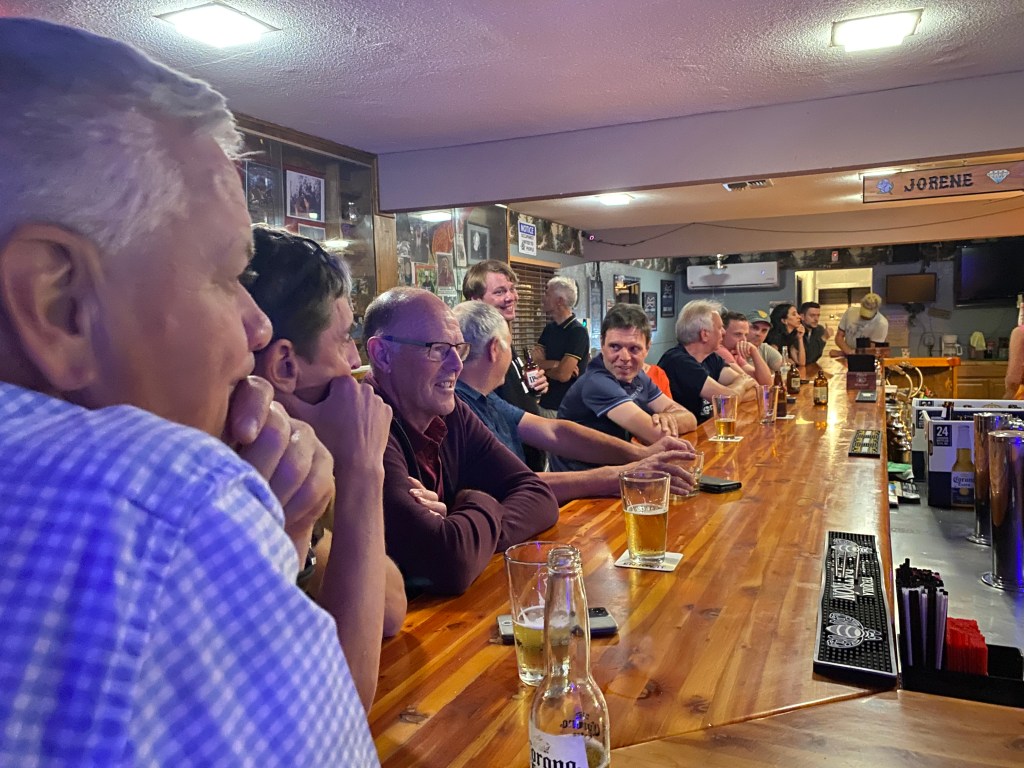 Dat zingen kent nog een vervolg. Rudi loodst ons naar de enige kroeg in town, the Oakroom. Hij was al eens op prospectie geweest net na de rit en ze kenden hem nog toen we binnen kwamen. Er wordt local beer, IPA en en later ook wat sterkers besteld. Het duurt niet lang of de pool tables en de karaoke wordt overgenomen door de Ritsers. Met “Bicycle” van Queen volgt de ontlading van een zware maar mooie fietsweek.Ook de locals zingen mee in koor.