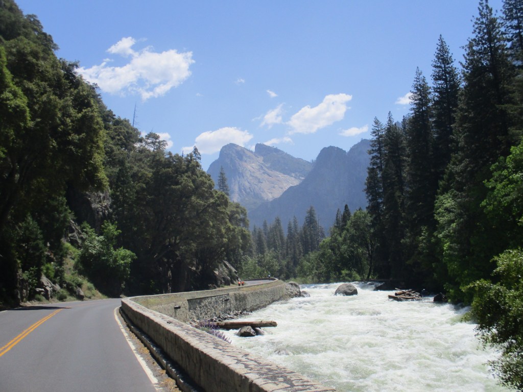 Hoe verder we klimmen richting de ingang van Yosemite National Park hoe beter de baan, maar hoe wilder de Merced wordt met overal schuimkoppen op het water. White water noemen ze dit, zeer gevaarlijk. Niettegenstaande zien we een aantal mensen langs de oever die aanstalten maken om te gaan raften. Dangerous stuff! Na de eerste stop bij een bruggetje waar het water van de rivier onderdoor buldert zien we de staart van de giga lange file park-toeristen. Het is zaterdag en de borden in Mariposa gaven het al aan: “Long waiting lines direction Yosemite”.