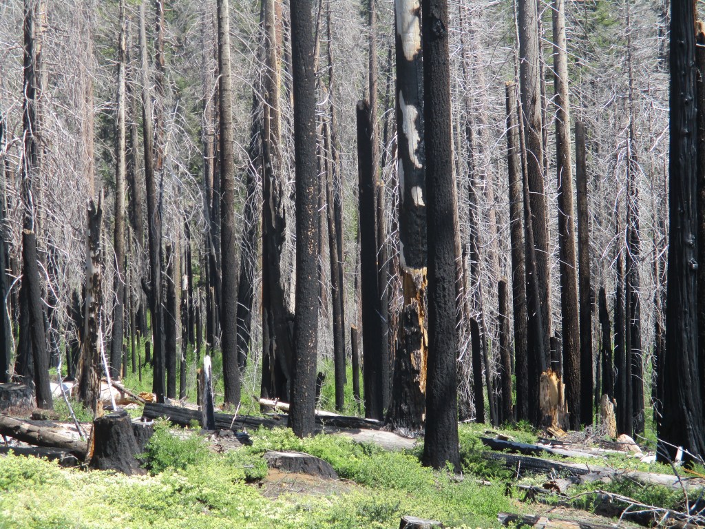 De bossen langs de weg zijn zowel mooi als mysterieus. Door de lange winter komt alles nu pas in bloei. Het bos staat vol met paarse hyacint(achtige) bloemen in fel contrast met de hoge zwart geblakerde bomen zonder bladeren als gevolg van de grote bosbranden die hier vorig jaar waren. Boven wachten we, Willie was wat achter. Waarschijnlijk iets kwijt? Enkel de route op zijn gps vandaag zegt hij.