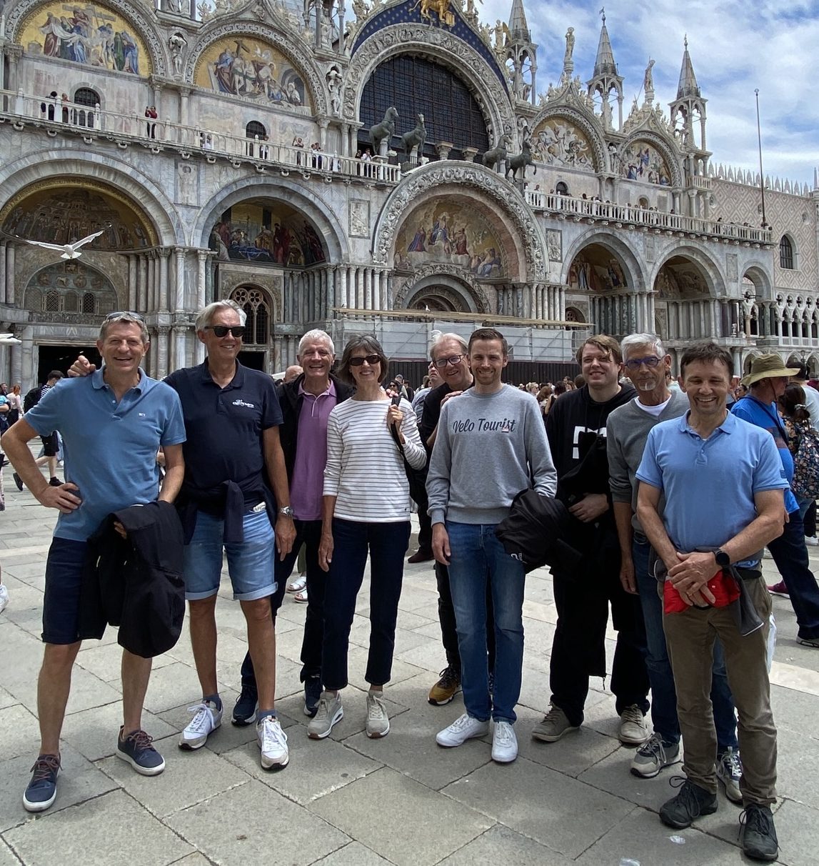 Geen dure koffie voor ons, ook geen gondel ( 90 euro) wel een pasta vongole, pizza en een glaasje rode wijn langs de Canal Grande. De lucht is helemaal opgeklaard maar Kim is het stappen al lang moe. Paul krijgt het lumineuze idee om de Vaporetto (waterbus) te nemen. We moeten er twee laten voorbijgaan wegens geen alerte veerman en Hans wordt voor het eerst boos. Na de ferrovia regent het pijpenstelen op weg naar het hotel. Leo en Mark zijn na een rit van 15 uur met de fietsen aangekomen. Alle fietsen zijn er bij… Tijd om naar het resto Enoteca Odeon te stappen. Ik ben 2 minuten te laat aan de receptie en de snoodaards zijn reeds vertrokken. Ik neem de taxi naar dit geweldig resto. Venezia speelt morgen voetbal en als ze winnen spelen ze in Serie A. Altijd fijne weetjes van taxichauffeurs. Ik drink nog een laatste glas met de empathische Leo. Morgen beginnen we eraan..!