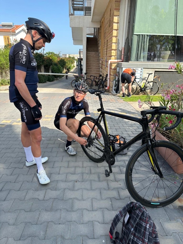 – vrijdag 6 juni: Mark, Leo en den Hollander Chris hadden de fietsen dus al uitgehaald en in elkaar gestoken zodat we vroeger weg kunnen (merci boys). Wat blijkt, en goed opgemerkt door Kim, onze noorderbuur die gedurende 17 jaar telkens 20.000 km fietst (340.000 in totaal dus) steekt z’n buitenbanden telkens fout op z’n Scott Addict LTD. Hij wist niet dat er een pijltje op de band staat die aanduidt in welke richting je hem erop moet leggen. We reizen om te leren…