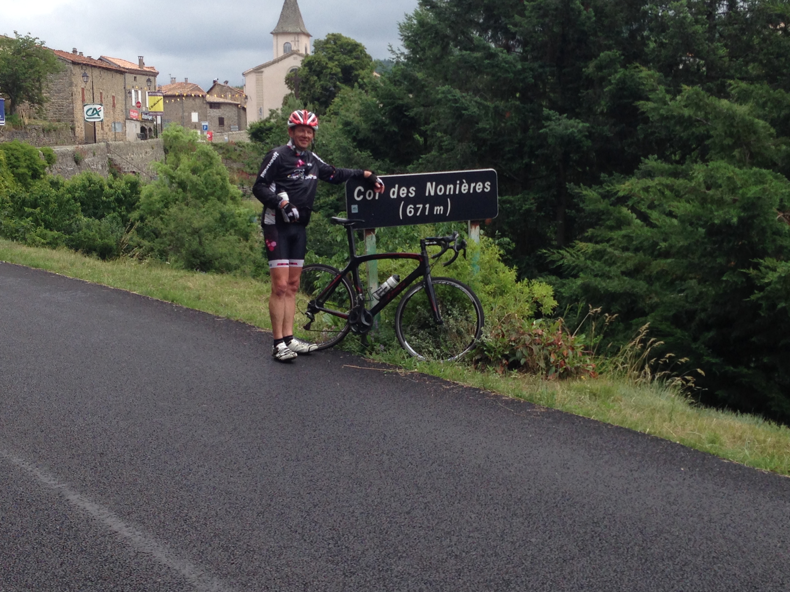 Ook hier ambiance in het dorpje, op 4km van de top. Er staat een mal kereltje met een hoge hoed die iedereen laat schrikken: Sabine deed bijna in haar broek. Nog 4km klefferen, dan een lange afdeling naar Privas, waar ons hotel is. Een zalige descente, waar de meeste Ritsers met doodsverachting afvliegen. Niet normaal, maar dat wisten we al, toch?