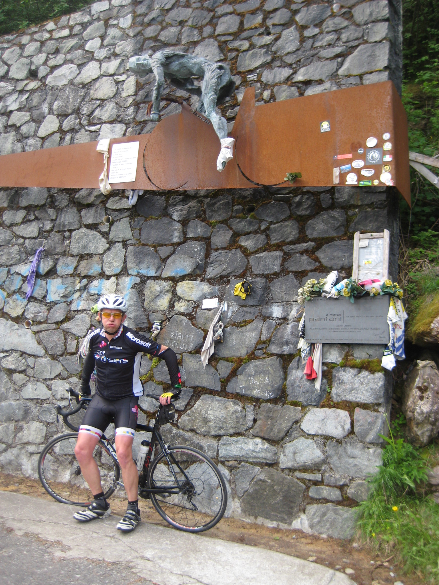 Dit is vakantie. Om 6 uur ’s morgens op, om halfzeven ontbijten en om 8 uur op de fiets voor niets minder dan de gevreesde Mortirollo, ook wel de Passo di Foppa genoemd, what’s in a name. Nog nooit zo’n zware berg beklommen. Hans sprak over La Redoute, maar dan x 10. En het zal niet ver af zijn. Vooral de eerste vijf, zes kilometer, met stukken van 26 procent, zijn onmenselijk op de quasi nuchtere maag. We kreunen, vloeken en zweten ons te pletter ondanks het vroege aanvangsuur. Hans had al niet veel zin vanmorgen, maar gelukkig kreeg ik hem nog mee. Even verpozen aan het standbeeld van de onfortuinlijke Pantani voor een gelukbrengende foto, maar het blijft zwoegen tot boven. Wat een klereberg, wie legt nu zoiets aan? Eens boven houdt Hans het voor gezien en klimt in de bezemwagen.