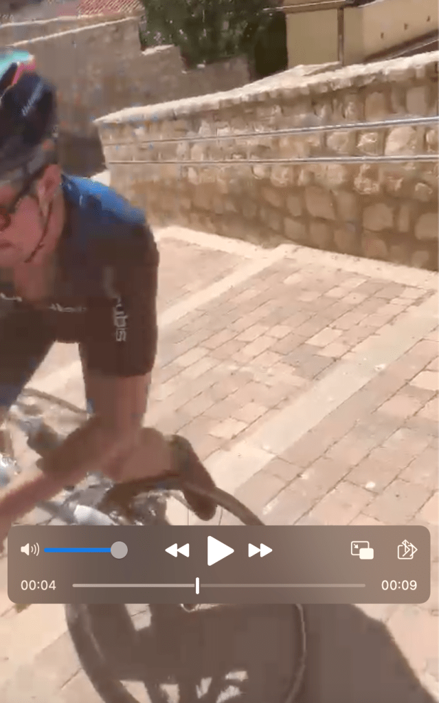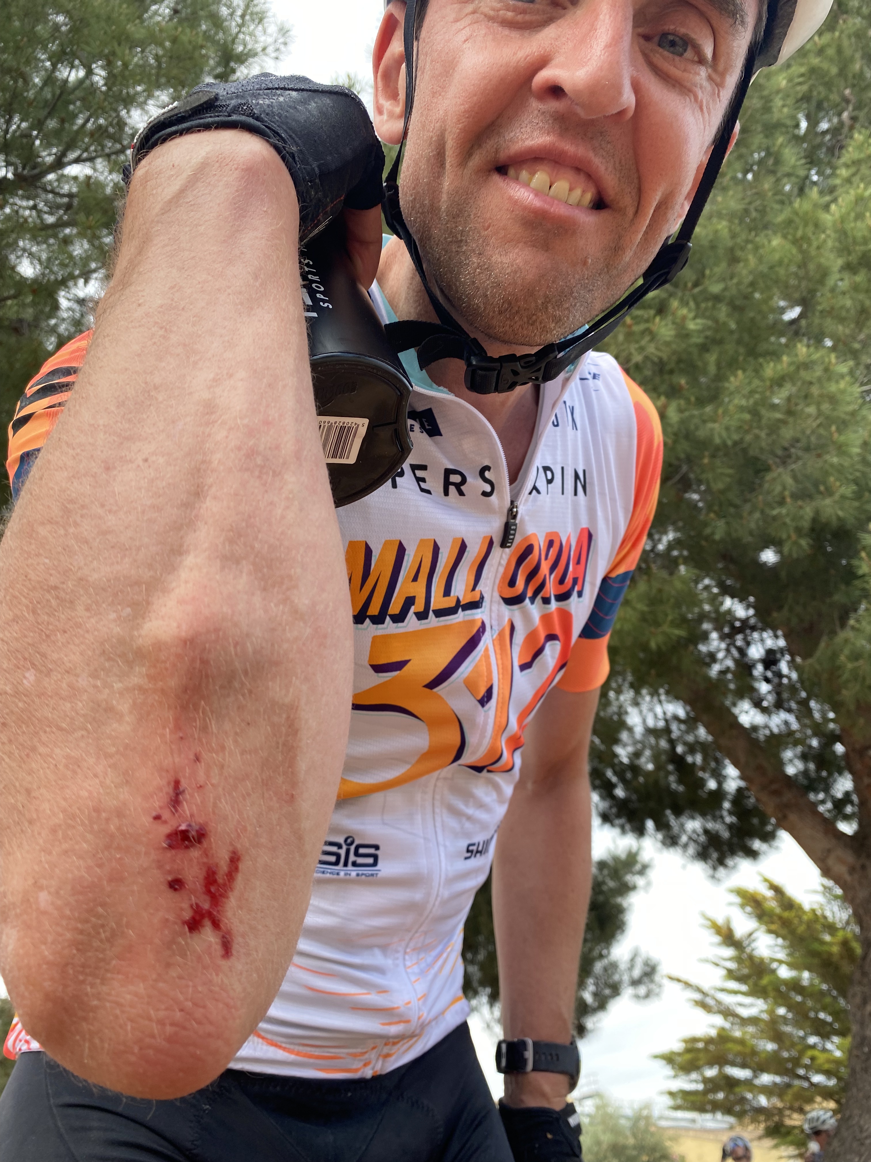 De laatste tocht gaat snel en we naderen ras tot de laatste klim. Jammer genoeg rijden Sus en Marleen nog plat op een boogscheut van de aankomst. En wat blijkt, Michsnel valt op de kiezeltjes net voor onze haciënda. Alsnog met bebloede elleboog komt ie toch weg.